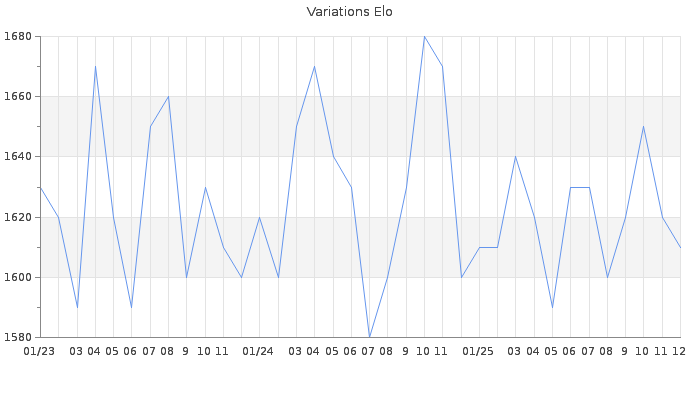 Date d'inscription : 08/03/13. Donateur pour EchecsEmail : Non ( Cliquez ici pour soutenir EchecsEmail. ) Elo non arrondi:1607.8 ( 325 sur 452 joueurs ) Nombre de victoires :2791 Nombre de nulles :232 Nombre de défaites :3045 Temps de réponse moyen par coup : 0J 4H 26M 12S ( Moyenne sur 3471 coups ). Rd ( Un petit rd indique un elo fiable ) : 50 Magic Elo:1600 Magic Rd : 350 Elo maximum atteint ( en étant classé ) :1800 Elo maximum atteint cette année :1660 Nombre coups joués : 195798 Inscrit dans l' équipe:Avalon Classement coupe : 32 Points coupe : 1257.8 Classement Coupe Magic Chess : Inactif Points Coupe Magic Chess : 0 Tournoi échelle : Inactif. Tournois gagnés : 04/12/2025 : Cat 2 : Victoire dans le tournoi n°27076 08/11/2025 : Cat 2 : Victoire dans le tournoi n°27165 09/10/2025 : Cat 2 : Victoire dans le tournoi n°27047 23/03/2025 : Cat 2 : Victoire dans le tournoi n°26591 19/03/2025 : Cat 2 : Victoire dans le tournoi n°26557 28/02/2025 : Cat 2 : Victoire dans le tournoi n°26438 13/02/2025 : Cat 2 : Victoire dans le tournoi n°26414 16/01/2025 : Cat 2 : Victoire dans le tournoi n°26346 16/11/2024 : Cat 2 : Victoire dans le tournoi n°26117 29/10/2024 : Cat 2 : Victoire dans le tournoi n°26062 28/10/2024 : Cat 2 : Victoire dans le tournoi n°26163 12/09/2024 : Cat 2 : Victoire dans le tournoi n°25995 22/08/2024 : Cat 2 : Victoire dans le tournoi n°25998 25/06/2024 : Cat 2 : Victoire dans le tournoi n°25845 09/06/2024 : Cat 2 : Victoire dans le tournoi n°25823 12/05/2024 : Cat 2 : Victoire dans le tournoi n°25801 08/05/2024 : Cat 2 : Victoire dans le tournoi n°25779 27/04/2024 : Cat 2 : Victoire dans le tournoi n°25718 30/03/2024 : Cat 2 : Victoire dans le tournoi n°25684 24/03/2024 : Cat 2 : Victoire dans le tournoi n°25672 24/01/2024 : Cat 2 : Victoire dans le tournoi n°25492 05/10/2023 : Cat 2 : Victoire dans le tournoi n°25216 29/09/2023 : Cat 2 : Victoire dans le tournoi n°25131 31/08/2023 : Cat 2 : Victoire dans le tournoi n°25093 26/08/2023 : Cat 2 : Victoire dans le tournoi n°25119 09/08/2023 : Cat 2 : Victoire dans le tournoi n°25070 04/08/2023 : Cat 2 : Victoire dans le tournoi n°24972 09/07/2023 : Cat 2 : Victoire dans le tournoi n°25028 24/05/2023 : Cat 2 : Victoire dans le tournoi n°24784 18/05/2023 : Cat 2 : Victoire dans le tournoi n°24858 20/04/2023 : Cat 2 : Victoire dans le tournoi n°24797 05/04/2023 : Cat 2 : Victoire dans le tournoi n°24626 25/03/2023 : Cat 2 : Victoire dans le tournoi n°24674 20/03/2023 : Cat 2 : Victoire dans le tournoi n°24744 04/03/2023 : Cat 2 : Victoire dans le tournoi n°24687 03/03/2023 : Cat 2 : Victoire dans le tournoi n°24586 20/12/2022 : Cat 3 : Victoire dans le tournoi n°24311 01/12/2022 : Cat 2 : Victoire dans le tournoi n°24411 13/11/2022 : Cat 2 : Victoire dans le tournoi n°24356 19/09/2022 : Cat 2 : Victoire dans le tournoi n°24218 02/09/2022 : Cat 2 : Victoire dans le tournoi n°23871 18/08/2022 : Cat 2 : Victoire dans le tournoi n°24165 10/08/2022 : Cat 2 : Victoire dans le tournoi n°24146 09/08/2022 : Cat 2 : Victoire dans le tournoi n°24119 20/07/2022 : Cat 2 : Victoire dans le tournoi n°24058 28/05/2022 : Cat 2 : Victoire dans le tournoi n°23939 27/05/2022 : Cat 2 : Victoire dans le tournoi n°23960 13/03/2022 : Cat 2 : Victoire dans le tournoi n°23647 27/02/2022 : Cat 2 : Victoire dans le tournoi n°23537 27/02/2022 : Cat 2 : Victoire dans le tournoi n°23556 24/01/2022 : Cat 2 : Victoire dans le tournoi n°23462 14/01/2022 : Cat 2 : Victoire dans le tournoi n°23246 31/10/2021 : Cat 2 : Victoire dans le tournoi n°23164 05/10/2021 : Cat 2 : Victoire dans le tournoi n°23203 09/09/2021 : Cat 2 : Victoire dans le tournoi n°23005 17/08/2021 : Cat 3 : Victoire dans le tournoi n°23029 03/08/2021 : Cat 2 : Victoire dans le tournoi n°22816 19/07/2021 : Cat 2 : Victoire dans le tournoi n°22919 03/06/2021 : Cat 2 : Victoire dans le tournoi n°22811 06/05/2021 : Cat 2 : Victoire dans le tournoi n°22338 06/04/2021 : Cat 2 : Victoire dans le tournoi n°22558 29/03/2021 : Cat 2 : Victoire dans le tournoi n°22540 13/03/2021 : Cat 2 : Victoire dans le tournoi n°22529 12/03/2021 : Cat 2 : Victoire dans le tournoi n°22479 21/02/2021 : Cat 2 : Victoire dans le tournoi n°22261 31/01/2021 : Cat 2 : Victoire dans le tournoi n°22302 23/01/2021 : Cat 2 : Victoire dans le tournoi n°22313 18/01/2021 : Cat 2 : Victoire dans le tournoi n°22250 29/12/2020 : Cat 2 : Victoire dans le tournoi n°22060 18/10/2020 : Cat 2 : Victoire dans le tournoi n°21872 15/10/2020 : Cat 2 : Victoire dans le tournoi n°21488 30/09/2020 : Cat 2 : Victoire dans le tournoi n°21812 19/09/2020 : Cat 2 : Victoire dans le tournoi n°21716 19/09/2020 : Cat 2 : Victoire dans le tournoi n°21768 14/09/2020 : Cat 2 : Victoire dans le tournoi n°21490 29/08/2020 : Cat 2 : Victoire dans le tournoi n°21686 11/08/2020 : Cat 2 : Victoire dans le tournoi n°21598 19/07/2020 : Cat 2 : Victoire dans le tournoi n°21456 26/06/2020 : Cat 2 : Victoire dans le tournoi n°21430 15/06/2020 : Cat 2 : Victoire dans le tournoi n°21380 15/04/2020 : Cat 2 : Victoire dans le tournoi n°21023 12/04/2020 : Cat 2 : Victoire dans le tournoi n°20927 23/03/2020 : Cat 2 : Victoire dans le tournoi n°20863 09/01/2020 : Cat 2 : Victoire dans le tournoi n°20527 09/12/2019 : Cat 2 : Victoire dans le tournoi n°20483 10/11/2019 : Cat 2 : Victoire dans le tournoi n°20211 03/11/2019 : Cat 2 : Victoire dans le tournoi n°20304 12/10/2019 : Cat 2 : Victoire dans le tournoi n°20238 24/09/2019 : Cat 2 : Victoire dans le tournoi n°19707 04/09/2019 : Cat 2 : Victoire dans le tournoi n°19996 03/09/2019 : Cat 2 : Victoire dans le tournoi n°19809 27/07/2019 : Cat 2 : Victoire dans le tournoi n°19847 17/07/2019 : Cat 2 : Victoire dans le tournoi n°19755 17/07/2019 : Cat 2 : Victoire dans le tournoi n°19828 09/06/2019 : Cat 2 : Victoire dans le tournoi n°19435 25/04/2019 : Cat 2 : Victoire dans le tournoi n°19422 16/02/2019 : Cat 2 : Victoire dans