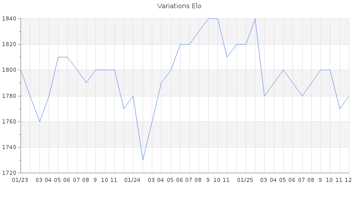 Date d'inscription : 12/06/13. Donateur pour EchecsEmail : Non ( Cliquez ici pour soutenir EchecsEmail. ) Elo non arrondi:1780.2 ( 231 sur 449 joueurs ) Nombre de victoires :4078 Nombre de nulles :478 Nombre de défaites :2434 Temps de réponse moyen par coup : 0J 4H 11M 33S ( Moyenne sur 1183 coups ). Rd ( Un petit rd indique un elo fiable ) : 61 Magic Elo:1440.3 Magic Rd : 251 Elo maximum atteint ( en étant classé ) :1990 Elo maximum atteint cette année :1850 Nombre coups joués : 243684 Inscrit dans l' équipe:cotenstock Classement coupe : Inactif, date de la dernière qualification : 23/08/22 Points coupe : 21.02 Classement Coupe Magic Chess : Inactif Points Coupe Magic Chess : 0 Tournoi échelle : Inactif. Tournois gagnés : 16/07/2021 : Cat 4 : Victoire dans le tournoi n°22894 07/06/2021 : Cat 4 : Victoire dans le tournoi n°22829 24/05/2021 : Cat 4 : Victoire dans le tournoi n°22790 28/01/2021 : Cat 3 : Victoire dans le tournoi n°22311 29/12/2020 : Cat 3 : Victoire dans le tournoi n°22136 03/11/2018 : Cat 3 : Victoire CC Oct18 Asc 22/03/2016 : Cat 3 : Victoire dans le tournoi n°14562 14/03/2016 : Cat 2 : Victoire dans le tournoi n°14451 23/10/2013 : Cat 2 : Victoire dans le tournoi n°13054 07/08/2013 : Cat 4 : Victoire dans le tournoi n°13116 06/08/2013 : Cat 2 : Victoire dans le tournoi n°13048 05/08/2013 : Cat 3 : Victoire dans le tournoi n°13056 04/08/2013 : Cat 2 : Victoire dans le tournoi n°12814 Nombre de tournois gagnés :13