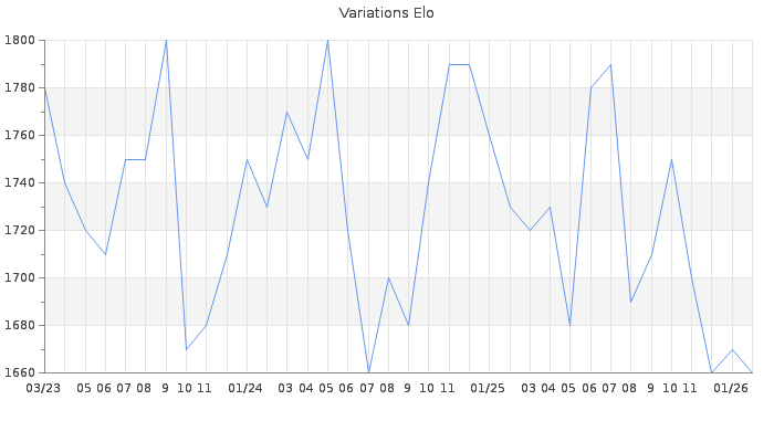 Date d'inscription : 12/02/08. Donateur pour EchecsEmail : Non ( Cliquez ici pour soutenir EchecsEmail. ) Elo non arrondi:1661.4 ( 301 sur 452 joueurs ) Nombre de victoires :14827 Nombre de nulles :3193 Nombre de défaites :14801 Temps de réponse moyen par coup : 0J 2H 34M 15S ( Moyenne sur 14014 coups ). Rd ( Un petit rd indique un elo fiable ) : 50 Magic Elo:1600 Magic Rd : 350 Elo maximum atteint ( en étant classé ) :1970 Elo maximum atteint cette année :1730 Nombre coups joués : 1129954 Inscrit dans l' équipe:LES CHATTERBOX Classement coupe : 22 Points coupe : 3311.88 Classement Coupe Magic Chess : Inactif Points Coupe Magic Chess : 0 Tournoi échelle : Division 3 : 5 Tournois gagnés : 06/02/2026 : Cat 2 : Victoire dans le tournoi n°27395 28/12/2025 : Cat 2 : Victoire dans le tournoi n°27321 16/12/2025 : Cat 2 : Victoire dans le tournoi n°27287 11/12/2025 : Cat 2 : Victoire dans le tournoi n°27281 20/11/2025 : Cat 3 : Victoire CC Nov25 Asc 01/11/2025 : Cat 3 : Victoire dans le tournoi n°27161 05/09/2025 : Cat 2 : Victoire dans le tournoi n°27024 01/08/2025 : Cat 2 : Victoire dans le tournoi n°26786 05/07/2025 : Cat 2 : Victoire dans le tournoi n°26803 30/06/2025 : Cat 3 : Victoire CC Juin25 Asc 08/06/2025 : Cat 2 : Victoire dans le tournoi n°26773 06/06/2025 : Cat 2 : Victoire dans le tournoi n°26804 04/06/2025 : Cat 2 : Victoire dans le tournoi n°26772 24/05/2025 : Cat 2 : Victoire dans le tournoi n°26739 20/05/2025 : Cat 2 : Premier au tournoi multi Saint-Valentin 2025 n°1 01/04/2025 : Cat 3 : Victoire dans le tournoi n°26308 21/03/2025 : Cat 3 : Victoire dans le tournoi n°26479 20/03/2025 : Cat 3 : Victoire CC Fev25 Asc 16/03/2025 : Cat 2 : Premier au tournoi multi Saint-Valentin 2025 n°2 01/03/2025 : Cat 2 : Victoire CC Jan25 Asc 24/01/2025 : Cat 3 : Victoire dans le tournoi n°26232 18/12/2024 : Cat 3 : Victoire dans le tournoi n°26286 25/11/2024 : Cat 3 : Victoire dans le tournoi n°26272 23/11/2024 : Cat 3 : Victoire dans le tournoi n°26244 19/11/2024 : Cat 2 : Victoire dans le tournoi n°26199 16/11/2024 : Cat 2 : Victoire dans le tournoi n°26210 14/11/2024 : Cat 2 : Victoire dans le tournoi n°26162 02/11/2024 : Cat 2 : Victoire dans le tournoi n°26144 25/10/2024 : Cat 2 : Victoire dans le tournoi n°26153 09/10/2024 : Cat 3 : Victoire dans le tournoi n°26093 05/09/2024 : Cat 2 : Victoire dans le tournoi n°26041 04/09/2024 : Cat 2 : Victoire dans le tournoi n°26044 27/08/2024 : Cat 2 : Victoire dans le tournoi n°26005 20/08/2024 : Cat 2 : Victoire dans le tournoi n°26001 31/07/2024 : Cat 3 : Victoire dans le tournoi n°25833 18/06/2024 : Cat 3 : Victoire dans le tournoi n°25861 10/06/2024 : Cat 3 : Victoire dans le tournoi n°25878 19/05/2024 : Cat 3 : Victoire dans le tournoi n°25830 14/05/2024 : Cat 2 : Victoire dans le tournoi n°25800 11/05/2024 : Cat 3 : Victoire dans le tournoi n°25797 08/05/2024 : Cat 3 : Victoire dans le tournoi n°25753 21/04/2024 : Cat 2 : Victoire dans le tournoi n°25702 10/04/2024 : Cat 3 : Victoire dans le tournoi n°25728 09/04/2024 : Cat 3 : Victoire dans le tournoi n°25717 23/03/2024 : Cat 2 : Victoire dans le tournoi n°25617 20/03/2024 : Cat 2 : Victoire CC Mar24 Asc 29/02/2024 : Cat 3 : Victoire dans le tournoi n°25620 27/01/2024 : Cat 2 : Victoire dans le tournoi n°25439 16/01/2024 : Cat 3 : Victoire dans le tournoi n°25503 12/01/2024 : Cat 3 : Victoire dans le tournoi n°25469 04/01/2024 : Cat 3 : Victoire dans le tournoi n°25477 24/12/2023 : Cat 2 : Victoire CC Dec23 16/12/2023 : Cat 2 : Victoire dans le tournoi n°25436 10/12/2023 : Cat 2 : Victoire dans le tournoi n°25391 01/12/2023 : Cat 2 : Victoire dans le tournoi n°25371 30/11/2023 : Cat 2 : Victoire dans le tournoi n°25047 29/11/2023 : Cat 2 : Victoire dans le tournoi n°25368 29/11/2023 : Cat 2 : Victoire CC Nov23 Asc 06/11/2023 : Cat 3 : Victoire dans le tournoi n°25246 04/11/2023 : Cat 3 : Victoire dans le tournoi n°25238 27/10/2023 : Cat 2 : Victoire dans le tournoi n°25309 11/09/2023 : Cat 2 : Victoire dans le tournoi n°25154 10/09/2023 : Cat 3 : Victoire dans le tournoi n°25191 29/08/2023 : Cat 2 : Victoire dans le tournoi n°25152 18/08/2023 : Cat 3 : Victoire dans le tournoi n°25075 27/07/2023 : Cat 3 : Victoire dans le tournoi n°24885 12/07/2023 : Cat 2 : Victoire dans le tournoi n°25045 13/06/2023 : Cat 3 : Victoire dans le tournoi n°24842 07/04/2023 : Cat 3 : Victoire dans le tournoi n°24731 30/03/2023 : Cat 3 : Victoire dans le tournoi n°24756 19/03/2023 : Cat 3 : Victoire dans le tournoi n°24734 01/02/2023 : Cat 3 : Victoire CC Dec22 Asc 30/01/2023 : Cat 3 : Victoire dans le tournoi n°24560 24/01/2023 : Cat 2 : Victoire dans le tournoi n°24480 15/01/2023 : Cat 3 : Victoire dans le tournoi n°24491 19/12/2022 : Cat 2 : Victoire dans le tournoi n°24448 15/12/2022 : Cat 2 : Victoire dans le tournoi n°24492 28/10/2022 : Cat 3 : Victoire dans le tournoi n°24282 29/09/2022 : Cat 3 : Victoire dans le tournoi n°24225 25/08/2022 : Cat 3 : Victoire dans le tournoi n°24173 12/08/2022 : Cat 3 : Victoire dans le tournoi n°24090 05/08/2022 : Cat 3 : Victoire dans le tournoi n°23767 12/07/2022 : Cat 3 : Victoire dans le tournoi n°24080 04/07/2022 : Cat 3 : Victoire dans le tournoi n°23866 01/07/2022 : Cat 3 : Victoire dans le tournoi n°23872 23/06/2022 : Cat 3 : Victoire dans le tournoi n°23970 19/06/2022 : Cat 3 : Victoire dans le tournoi n°24038 08/06/2022 : Cat 3 : Victoire dans le tournoi n°23903 07/06/2022 : Cat 3 : Victoire dans le tournoi n°23922 05/06/2022 : Cat 3 : Victoire dans le tournoi n°23944 23/05/2022 : Cat 3 : Victoire dans le tournoi n°23938 21/05/2022 : Cat 3 : Victoire dans le tournoi n°23833 16/04/2022 : Cat 3 : Victoire dans le tournoi n°23820 04/04/2022 : Cat 3 : Victoire dans le tournoi n°23740 03/04/2022 : Cat 3 : Victoire dans le tournoi n°23801 28/03/2022 : Cat 2 : Victoire dans le tournoi n°23634 18/03/2022 : Cat 2 : Victoire CC Fev22 Asc 14/03/2022 : Cat 3 : Victoire dans le 