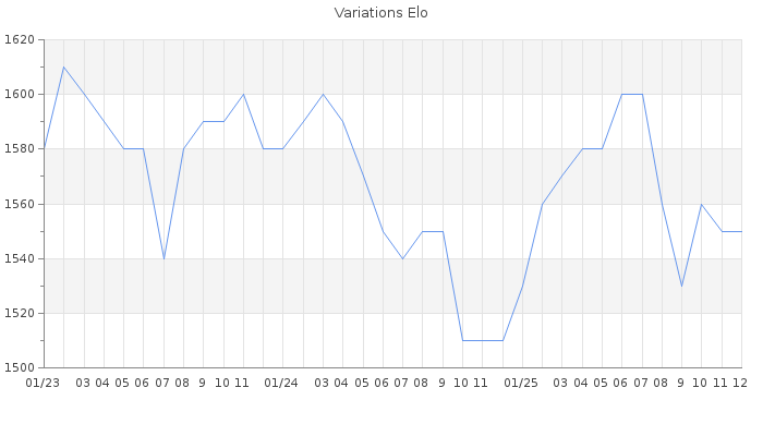 Date d'inscription : 06/03/15. Donateur pour EchecsEmail : Oui ( Cliquez ici pour soutenir EchecsEmail. ) Elo non arrondi:1550.4 ( 355 sur 460 joueurs ) Nombre de victoires :512 Nombre de nulles :23 Nombre de défaites :446 Temps de réponse moyen par coup : 0J 6H 51M 40S ( Moyenne sur 714 coups ). Rd ( Un petit rd indique un elo fiable ) : 59 Magic Elo:1600 Magic Rd : 350 Elo maximum atteint ( en étant classé ) :1720 Elo maximum atteint cette année :1630 Nombre coups joués : 34794 Classement coupe : Inactif Points coupe : 0 Classement Coupe Magic Chess : Inactif Points Coupe Magic Chess : 0 Tournoi échelle : Inactif. Tournois gagnés : 18/11/2025 : Cat 2 : Premier au tournoi multi Halloween 2025 n°4 17/02/2025 : Cat 2 : Premier au tournoi multi Noël 2024 n°1 27/01/2025 : Cat 1 : Premier au tournoi multi Noël 2024 n°4 28/12/2024 : Cat 1 : Premier au tournoi multi Halloween 2024 n°1 07/11/2024 : Cat 1 : Premier au tournoi multi Halloween 2024 n°4 07/03/2024 : Cat 2 : Premier au tournoi multi Saint-Valentin 2024 n°3 11/12/2023 : Cat 1 : Premier au tournoi multi Automne 2023 n°1 12/08/2023 : Cat 2 : Premier au tournoi multi Eté 2023 n°3 02/07/2022 : Cat 2 : Premier au tournoi multi Eté 2022 n°2 01/08/2021 : Cat 1 : Premier au tournoi multi Eté 2021 n°5 23/08/2019 : Cat 1 : Premier au tournoi multi Eté 2019 n°3 05/01/2019 : Cat 2 : Victoire dans le tournoi n°18914 31/10/2017 : Cat 0 : Premier au tournoi multi Automne 2017 n°5 02/09/2017 : Cat 2 : Victoire dans le tournoi n°16955 12/07/2017 : Cat 1 : Premier au tournoi multi Eté 2017 n°6 Nombre de tournois gagnés :26