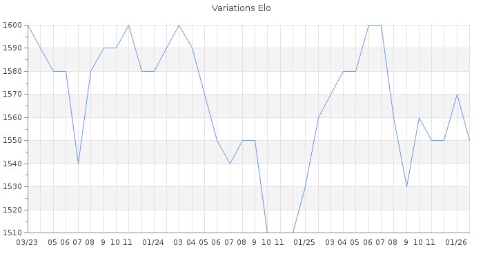 Date d'inscription : 06/03/15. Donateur pour EchecsEmail : Oui ( Cliquez ici pour soutenir EchecsEmail. ) Elo non arrondi:1547.3 ( 346 sur 454 joueurs ) Nombre de victoires :521 Nombre de nulles :23 Nombre de défaites :453 Temps de réponse moyen par coup : 0J 6H 42M 55S ( Moyenne sur 664 coups ). Rd ( Un petit rd indique un elo fiable ) : 62 Magic Elo:1600 Magic Rd : 350 Elo maximum atteint ( en étant classé ) :1720 Elo maximum atteint cette année :1580 Nombre coups joués : 35296 Classement coupe : Inactif Points coupe : 0 Classement Coupe Magic Chess : Inactif Points Coupe Magic Chess : 0 Tournoi échelle : Inactif. Tournois gagnés : 06/01/2026 : Cat 2 : Premier au tournoi multi Noël 2025 n°3 18/11/2025 : Cat 2 : Premier au tournoi multi Halloween 2025 n°4 17/02/2025 : Cat 2 : Premier au tournoi multi Noël 2024 n°1 27/01/2025 : Cat 1 : Premier au tournoi multi Noël 2024 n°4 28/12/2024 : Cat 1 : Premier au tournoi multi Halloween 2024 n°1 07/11/2024 : Cat 1 : Premier au tournoi multi Halloween 2024 n°4 07/03/2024 : Cat 2 : Premier au tournoi multi Saint-Valentin 2024 n°3 11/12/2023 : Cat 1 : Premier au tournoi multi Automne 2023 n°1 12/08/2023 : Cat 2 : Premier au tournoi multi Eté 2023 n°3 02/07/2022 : Cat 2 : Premier au tournoi multi Eté 2022 n°2 01/08/2021 : Cat 1 : Premier au tournoi multi Eté 2021 n°5 23/08/2019 : Cat 1 : Premier au tournoi multi Eté 2019 n°3 05/01/2019 : Cat 2 : Victoire dans le tournoi n°18914 31/10/2017 : Cat 0 : Premier au tournoi multi Automne 2017 n°5 02/09/2017 : Cat 2 : Victoire dans le tournoi n°16955 12/07/2017 : Cat 1 : Premier au tournoi multi Eté 2017 n°6 Nombre de tournois gagnés :28
