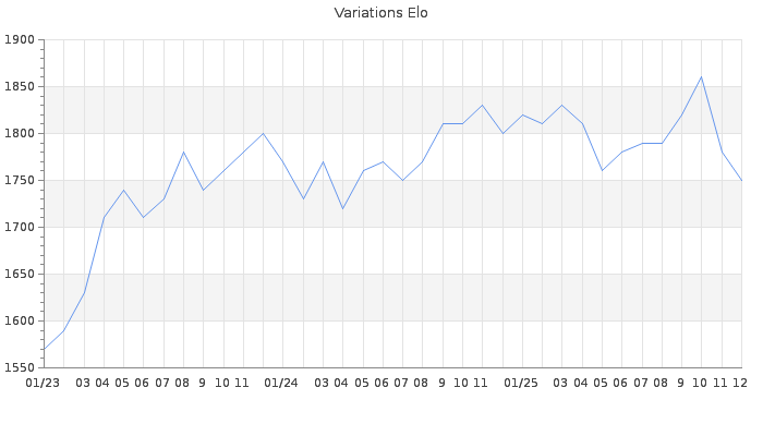 Date d'inscription : 26/10/10. Donateur pour EchecsEmail : Non ( Cliquez ici pour soutenir EchecsEmail. ) Elo non arrondi:1750.6 ( 248 sur 449 joueurs ) Nombre de victoires :1254 Nombre de nulles :122 Nombre de défaites :1161 Temps de réponse moyen par coup : 0J 4H 29M 41S ( Moyenne sur 1461 coups ). Rd ( Un petit rd indique un elo fiable ) : 60 Magic Elo:1630.16 Magic Rd : 80 Elo maximum atteint ( en étant classé ) :1920 Elo maximum atteint cette année :1870 Nombre coups joués : 117005 Inscrit dans l' équipe:les fous de bassans Classement coupe : Inactif Points coupe : 0 Classement Coupe Magic Chess : Inactif Points Coupe Magic Chess : 0 Tournoi échelle : Inactif. Tournois gagnés : 10/02/2017 : Cat 2 : Victoire dans le tournoi n°16005 20/04/2015 : Cat 3 : Victoire dans le tournoi n°17024 01/10/2013 : Cat 3 : Victoire dans le tournoi n°13337 Nombre de tournois gagnés :3