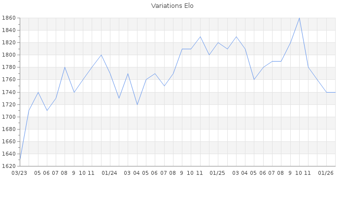 Date d'inscription : 26/10/10. Donateur pour EchecsEmail : Non ( Cliquez ici pour soutenir EchecsEmail. ) Elo non arrondi:1741.1 ( 263 sur 463 joueurs ) Nombre de victoires :1267 Nombre de nulles :123 Nombre de défaites :1178 Temps de réponse moyen par coup : 0J 5H 26M 14S ( Moyenne sur 1296 coups ). Rd ( Un petit rd indique un elo fiable ) : 50 Magic Elo:1630.16 Magic Rd : 80 Elo maximum atteint ( en étant classé ) :1920 Elo maximum atteint cette année :1750 Nombre coups joués : 118228 Inscrit dans l' équipe:les fous de bassans Classement coupe : Inactif Points coupe : 0 Classement Coupe Magic Chess : Inactif Points Coupe Magic Chess : 0 Tournoi échelle : Inactif. Tournois gagnés : 10/02/2017 : Cat 2 : Victoire dans le tournoi n°16005 20/04/2015 : Cat 3 : Victoire dans le tournoi n°17024 01/10/2013 : Cat 3 : Victoire dans le tournoi n°13337 Nombre de tournois gagnés :3