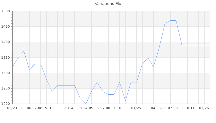 Date d'inscription : 14/07/14. Donateur pour EchecsEmail : Non ( Cliquez ici pour soutenir EchecsEmail. ) Elo non arrondi:1389.8 ( 414 sur 461 joueurs ) Nombre de victoires :152 Nombre de nulles :7 Nombre de défaites :254 Temps de réponse moyen par coup : 0J 12H 24M 36S ( Moyenne sur 33 coups ). Rd ( Un petit rd indique un elo fiable ) : 86 Magic Elo:1600 Magic Rd : 350 Elo maximum atteint ( en étant classé ) :1510 Elo maximum atteint cette année :0 Nombre coups joués : 15782 Classement coupe : Inactif Points coupe : 0 Classement Coupe Magic Chess : Inactif Points Coupe Magic Chess : 0 Tournoi échelle : Inactif. Tournois gagnés : 04/09/2015 : Cat 0 : Victoire dans le tournoi n°18080 Nombre de tournois gagnés :1