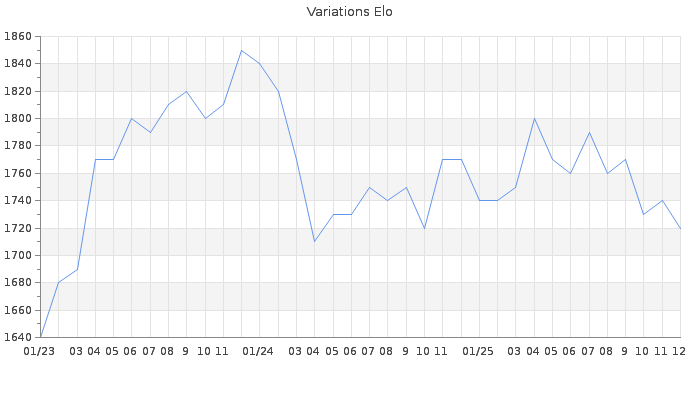 Date d'inscription : 06/04/20. Donateur pour EchecsEmail : Non ( Cliquez ici pour soutenir EchecsEmail. ) Elo non arrondi:1716.9 ( 269 sur 452 joueurs ) Nombre de victoires :398 Nombre de nulles :15 Nombre de défaites :115 Temps de réponse moyen par coup : 0J 2H 56M 15S ( Moyenne sur 1069 coups ). Rd ( Un petit rd indique un elo fiable ) : 60 Elo maximum atteint ( en étant classé ) :1880 Elo maximum atteint cette année :1800 Nombre coups joués : 21604 Classement coupe : Inactif Points coupe : 0 Classement Coupe Magic Chess : Inactif Points Coupe Magic Chess : 0 Tournoi échelle : Nombre de tournois gagnés :0