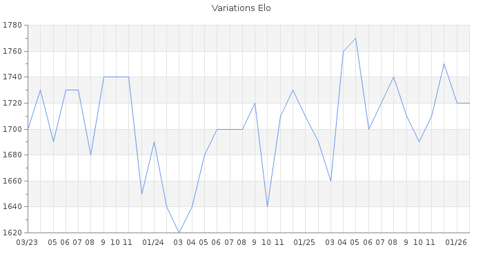 Date d'inscription : 07/01/11. Donateur pour EchecsEmail : Non ( Cliquez ici pour soutenir EchecsEmail. ) Elo non arrondi:1720.5 ( 273 sur 463 joueurs ) Nombre de victoires :3240 Nombre de nulles :440 Nombre de défaites :2596 Temps de réponse moyen par coup : 0J 3H 1M 49S ( Moyenne sur 4414 coups ). Rd ( Un petit rd indique un elo fiable ) : 58 Magic Elo:1529.55 Magic Rd : 85 Elo maximum atteint ( en étant classé ) :1880 Elo maximum atteint cette année :1780 Nombre coups joués : 267354 Inscrit dans l' équipe:les fous de bassans Classement coupe : Inactif, date de la dernière qualification : 09/04/23 Points coupe : 3.45 Classement Coupe Magic Chess : Inactif Points Coupe Magic Chess : 0 Tournoi échelle : Inactif. Tournois gagnés : 02/01/2025 : Cat 2 : Victoire dans le tournoi n°26340 10/04/2022 : Cat 2 : Victoire dans le tournoi n°23671 23/10/2021 : Cat 2 : Victoire dans le tournoi n°23155 27/08/2021 : Cat 2 : Victoire dans le tournoi n°22841 05/08/2021 : Cat 2 : Victoire dans le tournoi n°22809 22/02/2021 : Cat 2 : Victoire dans le tournoi n°22354 06/02/2021 : Cat 2 : Victoire dans le tournoi n°22240 22/05/2020 : Cat 2 : Victoire dans le tournoi n°21193 15/03/2020 : Cat 1 : Premier au tournoi multi Saint-Valentin 2020 n°6 19/03/2019 : Cat 2 : Victoire dans le tournoi n°18953 16/07/2018 : Cat 2 : Victoire dans le tournoi n°18308 03/06/2018 : Cat 2 : Victoire dans le tournoi n°18009 02/11/2016 : Cat 2 : Victoire dans le tournoi n°15471 15/08/2015 : Cat 3 : Victoire dans le tournoi n°17735 22/06/2015 : Cat 3 : Victoire dans le tournoi n°17731 13/09/2014 : Cat 2 : Victoire dans le tournoi n°15804 Nombre de tournois gagnés :17