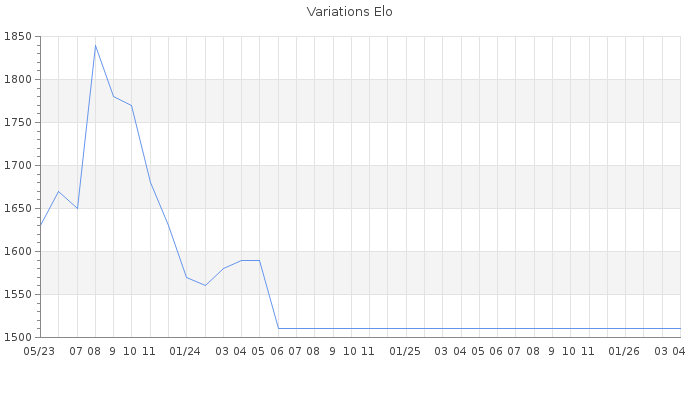 Date d'inscription : 14/05/22. Donateur pour EchecsEmail : Non ( Cliquez ici pour soutenir EchecsEmail. ) Elo non arrondi:1472 ( 398 sur 452 joueurs ) Nombre de victoires :553 Nombre de nulles :51 Nombre de défaites :605 Temps de réponse moyen par coup : 0J 11H 2M 24S ( Moyenne sur 0 coups ). Rd ( Un petit rd indique un elo fiable ) : 53 Magic Elo:1700 Magic Rd : 350 Elo maximum atteint ( en étant classé ) :1880 Elo maximum atteint cette année :0 Nombre coups joués : 38139 Classement coupe : Inactif, date de la dernière qualification : 12/05/24 Points coupe : 112.89 Classement Coupe Magic Chess : Inactif Points Coupe Magic Chess : 0 Tournoi échelle : Inactif. Tournois gagnés : 04/02/2024 : Cat 2 : Victoire dans le tournoi n°25437 21/10/2023 : Cat 3 : Victoire CC Oct23 Asc 20/09/2023 : Cat 3 : Victoire dans le tournoi n°25170 19/09/2023 : Cat 3 : Victoire dans le tournoi n°25192 15/08/2023 : Cat 2 : Premier au tournoi multi Eté 2023 n°1 27/07/2023 : Cat 2 : Premier au tournoi multi Eté 2023 n°2 17/05/2023 : Cat 2 : Premier au tournoi multi Printemps 2023 n°3 28/04/2023 : Cat 2 : Victoire CC Avr23 Asc 29/03/2023 : Cat 3 : Victoire dans le tournoi n°24661 23/03/2023 : Cat 1 : Premier au tournoi multi Saint-Valentin 2023 n°4 06/12/2022 : Cat 3 : Victoire dans le tournoi n°24325 28/09/2022 : Cat 2 : Victoire CC Aut22 Asc 29/08/2022 : Cat 2 : Victoire dans le tournoi n°24065 17/07/2022 : Cat 3 : Victoire dans le tournoi n°24053 Nombre de tournois gagnés :18