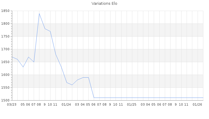 Date d'inscription : 14/05/22. Donateur pour EchecsEmail : Non ( Cliquez ici pour soutenir EchecsEmail. ) Elo non arrondi:1477 ( 398 sur 458 joueurs ) Nombre de victoires :553 Nombre de nulles :51 Nombre de défaites :605 Temps de réponse moyen par coup : 0J 11H 2M 24S ( Moyenne sur 0 coups ). Rd ( Un petit rd indique un elo fiable ) : 53 Magic Elo:1700 Magic Rd : 350 Elo maximum atteint ( en étant classé ) :1880 Elo maximum atteint cette année :0 Nombre coups joués : 38139 Classement coupe : Inactif, date de la dernière qualification : 12/05/24 Points coupe : 125.08 Classement Coupe Magic Chess : Inactif Points Coupe Magic Chess : 0 Tournoi échelle : Inactif. Tournois gagnés : 04/02/2024 : Cat 2 : Victoire dans le tournoi n°25437 21/10/2023 : Cat 3 : Victoire CC Oct23 Asc 20/09/2023 : Cat 3 : Victoire dans le tournoi n°25170 19/09/2023 : Cat 3 : Victoire dans le tournoi n°25192 15/08/2023 : Cat 2 : Premier au tournoi multi Eté 2023 n°1 27/07/2023 : Cat 2 : Premier au tournoi multi Eté 2023 n°2 17/05/2023 : Cat 2 : Premier au tournoi multi Printemps 2023 n°3 28/04/2023 : Cat 2 : Victoire CC Avr23 Asc 29/03/2023 : Cat 3 : Victoire dans le tournoi n°24661 23/03/2023 : Cat 1 : Premier au tournoi multi Saint-Valentin 2023 n°4 06/12/2022 : Cat 3 : Victoire dans le tournoi n°24325 28/09/2022 : Cat 2 : Victoire CC Aut22 Asc 29/08/2022 : Cat 2 : Victoire dans le tournoi n°24065 17/07/2022 : Cat 3 : Victoire dans le tournoi n°24053 Nombre de tournois gagnés :18