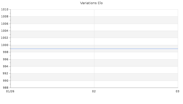 Date d'inscription : 25/01/26. Donateur pour EchecsEmail : Non ( Cliquez ici pour soutenir EchecsEmail. ) Elo non arrondi:1000 ( 444 sur 445 joueurs ) Nombre de victoires :0 Nombre de nulles :0 Nombre de défaites :1 Temps de réponse moyen par coup : 1J 0H 51M 14S ( Moyenne sur 19 coups ). Rd ( Un petit rd indique un elo fiable ) : 261 Elo maximum atteint ( en étant classé ) :0 Elo maximum atteint cette année :0 Nombre coups joués : 28 Classement coupe : Inactif Points coupe : 0 Classement Coupe Magic Chess : Inactif Points Coupe Magic Chess : 0 Tournoi échelle : Nombre de tournois gagnés :0