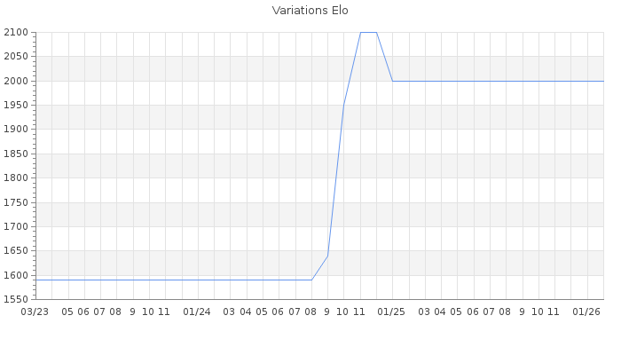 Date d'inscription : 28/12/18. Donateur pour EchecsEmail : Non ( Cliquez ici pour soutenir EchecsEmail. ) Elo non arrondi:1973.7 ( 145 sur 463 joueurs ) Nombre de victoires :42 Nombre de nulles :5 Nombre de défaites :13 Temps de réponse moyen par coup : 0J 5H 11M 57S ( Moyenne sur 1 coups ). Rd ( Un petit rd indique un elo fiable ) : 82 Magic Elo:1700 Magic Rd : 350 Elo maximum atteint ( en étant classé ) :2110 Elo maximum atteint cette année :0 Nombre coups joués : 1512 Classement coupe : Inactif Points coupe : 0.06 Classement Coupe Magic Chess : Inactif Points Coupe Magic Chess : 0 Tournoi échelle : Inactif. Tournois gagnés : 24/11/2024 : Cat 4 : Victoire dans le tournoi n°26255 23/11/2024 : Cat 4 : Victoire dans le tournoi n°26245 19/11/2024 : Cat 4 : Victoire dans le tournoi n°26230 27/10/2024 : Cat 3 : Victoire dans le tournoi n°26167 05/10/2024 : Cat 2 : Victoire dans le tournoi n°26108 20/01/2019 : Cat 1 : Victoire dans le tournoi n°19107 Nombre de tournois gagnés :6