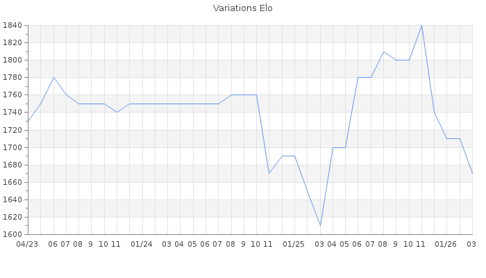 Date d'inscription : 20/10/07. Donateur pour EchecsEmail : Non ( Cliquez ici pour soutenir EchecsEmail. ) Elo non arrondi:1672.6 ( 285 sur 445 joueurs ) Nombre de victoires :879 Nombre de nulles :51 Nombre de défaites :879 Temps de réponse moyen par coup : 0J 2H 25M 3S ( Moyenne sur 149 coups ). Rd ( Un petit rd indique un elo fiable ) : 89 Magic Elo:1600 Magic Rd : 350 Elo maximum atteint ( en étant classé ) :1900 Elo maximum atteint cette année :1780 Nombre coups joués : 49903 Inscrit dans l' équipe:Sol Seppy Classement coupe : Inactif Points coupe : 0 Classement Coupe Magic Chess : Inactif Points Coupe Magic Chess : 0 Tournoi échelle : Inactif. Nombre de tournois gagnés :0