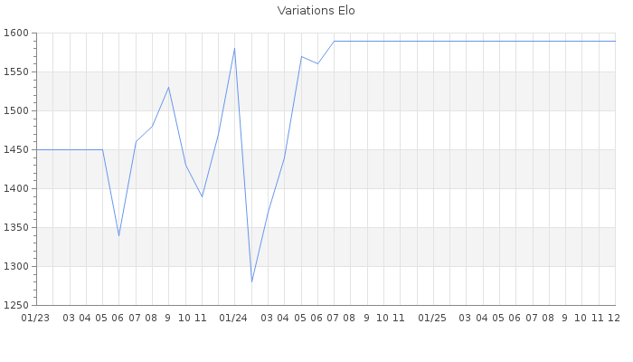 Date d'inscription : 28/07/20. Donateur pour EchecsEmail : Non ( Cliquez ici pour soutenir EchecsEmail. ) Elo non arrondi:1561.5 ( 351 sur 448 joueurs ) Nombre de victoires :336 Nombre de nulles :15 Nombre de défaites :280 Temps de réponse moyen par coup : 0J 8H 17M 38S ( Moyenne sur 0 coups ). Rd ( Un petit rd indique un elo fiable ) : 58 Elo maximum atteint ( en étant classé ) :1660 Elo maximum atteint cette année :0 Nombre coups joués : 14164 Classement coupe : Inactif Points coupe : 1.33 Classement Coupe Magic Chess : Inactif Points Coupe Magic Chess : 0 Tournoi échelle : Inactif. Tournois gagnés : 09/07/2024 : Cat 1 : Victoire dans le tournoi n°25827 27/05/2024 : Cat 1 : Victoire dans le tournoi n°25731 26/05/2024 : Cat 0 : Victoire dans le tournoi n°25690 06/04/2024 : Cat 1 : Victoire dans le tournoi n°25716 31/03/2024 : Cat 0 : Victoire dans le tournoi n°25633 30/01/2024 : Cat 1 : Victoire dans le tournoi n°25491 08/01/2024 : Cat 1 : Victoire dans le tournoi n°25395 15/12/2023 : Cat 1 : Victoire dans le tournoi n°25423 24/10/2023 : Cat 1 : Victoire dans le tournoi n°25215 25/09/2023 : Cat 1 : Victoire dans le tournoi n°25221 10/08/2023 : Cat 1 : Victoire dans le tournoi n°25082 10/08/2023 : Cat 1 : Victoire dans le tournoi n°24993 21/07/2023 : Cat 1 : Victoire dans le tournoi n°25067 28/10/2020 : Cat 3 : Victoire dans le tournoi n°21837 25/10/2020 : Cat 2 : Victoire dans le tournoi n°21870 13/10/2020 : Cat 2 : Victoire dans le tournoi n°21821 10/10/2020 : Cat 2 : Victoire dans le tournoi n°21868 07/10/2020 : Cat 2 : Victoire dans le tournoi n°21754 01/10/2020 : Cat 2 : Victoire dans le tournoi n°21737 30/09/2020 : Cat 2 : Victoire dans le tournoi n°21785 22/09/2020 : Cat 2 : Victoire dans le tournoi n°21721 26/08/2020 : Cat 2 : Victoire dans le tournoi n°21667 Nombre de tournois gagnés :22