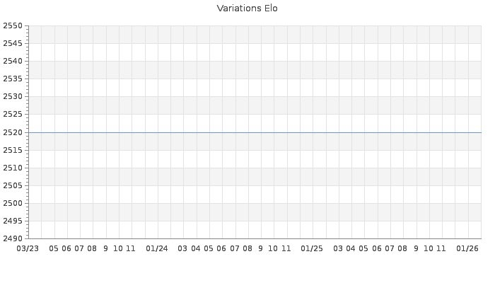 Date d'inscription : 14/05/17. Donateur pour EchecsEmail : Non ( Cliquez ici pour soutenir EchecsEmail. ) Elo non arrondi:2465.5 ( 32 sur 459 joueurs ) Nombre de victoires :69 Nombre de nulles :55 Nombre de défaites :23 Rd ( Un petit rd indique un elo fiable ) : 79 Elo maximum atteint ( en étant classé ) :2820 Elo maximum atteint cette année :0 Nombre coups joués : 4756 Inscrit dans l' équipe:Les Rebelles Classement coupe : Inactif Points coupe : 0.74 Classement Coupe Magic Chess : Inactif Points Coupe Magic Chess : 0 Tournoi échelle : Inactif. Tournois gagnés : 01/10/2019 : Cat 9 : Victoire CC Printemps 2019 15/06/2019 : Cat 6 : Victoire CC Avr19 11/04/2018 : Cat 7 : Victoire dans le tournoi n°17469 Nombre de tournois gagnés :3