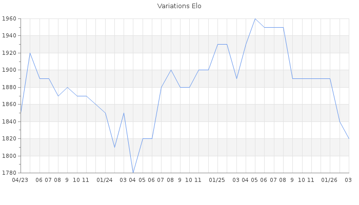 Date d'inscription : 22/07/17. Donateur pour EchecsEmail : Non ( Cliquez ici pour soutenir EchecsEmail. ) Elo non arrondi:1815.5 ( 214 sur 439 joueurs ) Nombre de victoires :70 Nombre de nulles :4 Nombre de défaites :50 Temps de réponse moyen par coup : 0J 8H 40M 13S ( Moyenne sur 108 coups ). Rd ( Un petit rd indique un elo fiable ) : 105 Magic Elo:1700 Magic Rd : 350 Elo maximum atteint ( en étant classé ) :2330 Elo maximum atteint cette année :1860 Nombre coups joués : 4723 Classement coupe : Inactif Points coupe : 0 Classement Coupe Magic Chess : Inactif Points Coupe Magic Chess : 0 Tournoi échelle : Nombre de tournois gagnés :0