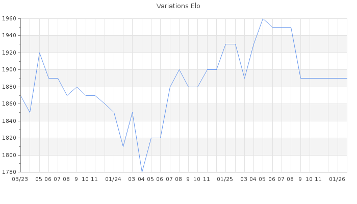 Date d'inscription : 22/07/17. Donateur pour EchecsEmail : Non ( Cliquez ici pour soutenir EchecsEmail. ) Elo non arrondi:1886.8 ( 187 sur 463 joueurs ) Nombre de victoires :70 Nombre de nulles :4 Nombre de défaites :47 Temps de réponse moyen par coup : 0J 14H 2M 16S ( Moyenne sur 63 coups ). Rd ( Un petit rd indique un elo fiable ) : 90 Magic Elo:1700 Magic Rd : 350 Elo maximum atteint ( en étant classé ) :2330 Elo maximum atteint cette année :0 Nombre coups joués : 4622 Classement coupe : Inactif Points coupe : 0 Classement Coupe Magic Chess : Inactif Points Coupe Magic Chess : 0 Tournoi échelle : Nombre de tournois gagnés :0
