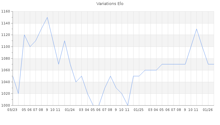 Date d'inscription : 03/10/21. Donateur pour EchecsEmail : Non ( Cliquez ici pour soutenir EchecsEmail. ) Elo non arrondi:1065.7 ( 451 sur 458 joueurs ) Nombre de victoires :49 Nombre de nulles :1 Nombre de défaites :764 Temps de réponse moyen par coup : 0J 0H 26M 54S ( Moyenne sur 2223 coups ). Rd ( Un petit rd indique un elo fiable ) : 76 Magic Elo:1504.73 Magic Rd : 292 Elo maximum atteint ( en étant classé ) :1150 Elo maximum atteint cette année :1110 Nombre coups joués : 31046 Classement coupe : Inactif Points coupe : 0 Classement Coupe Magic Chess : Inactif Points Coupe Magic Chess : 0 Tournoi échelle : Inactif. Nombre de tournois gagnés :0
