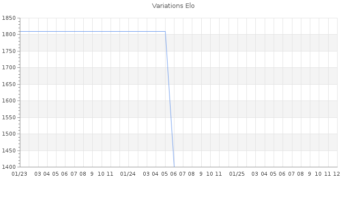 Date d'inscription : 26/08/20. Donateur pour EchecsEmail : Non ( Cliquez ici pour soutenir EchecsEmail. ) Elo non arrondi:1376 ( 443 sur 448 joueurs ) Nombre de victoires :0 Nombre de nulles :0 Nombre de défaites :15 Temps de réponse moyen par coup : 2J 8H 48M 59S ( Moyenne sur 0 coups ). Rd ( Un petit rd indique un elo fiable ) : 146 Elo maximum atteint ( en étant classé ) :1410 Elo maximum atteint cette année :0 Nombre coups joués : 43 Classement coupe : Inactif Points coupe : 0 Classement Coupe Magic Chess : Inactif Points Coupe Magic Chess : 0 Tournoi échelle : Nombre de tournois gagnés :0