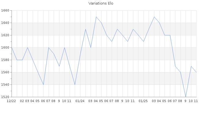 Date d'inscription : 24/01/14. Donateur pour EchecsEmail : Oui ( Cliquez ici pour soutenir EchecsEmail. ) Elo non arrondi:1561.4 ( 344 sur 459 joueurs ) Nombre de victoires :911 Nombre de nulles :41 Nombre de défaites :2016 Temps de réponse moyen par coup : 0J 2H 19M 54S ( Moyenne sur 2105 coups ). Rd ( Un petit rd indique un elo fiable ) : 54 Magic Elo:1600 Magic Rd : 350 Elo maximum atteint ( en étant classé ) :1680 Elo maximum atteint cette année :1670 Nombre coups joués : 100442 Inscrit dans l' équipe:Avalon Classement coupe : Inactif Points coupe : 3.17 Classement Coupe Magic Chess : Inactif Points Coupe Magic Chess : 0 Tournoi échelle : Inactif. Nombre de tournois gagnés :0