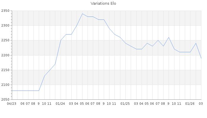 Date d'inscription : 12/02/19. Donateur pour EchecsEmail : Non ( Cliquez ici pour soutenir EchecsEmail. ) Elo non arrondi:2189.4 ( 64 sur 439 joueurs ) Nombre de victoires :416 Nombre de nulles :54 Nombre de défaites :229 Temps de réponse moyen par coup : 0J 9H 36M 1S ( Moyenne sur 691 coups ). Rd ( Un petit rd indique un elo fiable ) : 62 Magic Elo:1323.62 Magic Rd : 175 Elo maximum atteint ( en étant classé ) :2360 Elo maximum atteint cette année :2240 Nombre coups joués : 22808 Classement coupe : 65 Points coupe : 315.59 Classement Coupe Magic Chess : Inactif Points Coupe Magic Chess : 0 Tournoi échelle : Inactif. Tournois gagnés : 09/10/2025 : Cat 4 : Victoire CC Sep25 26/09/2025 : Cat 5 : Victoire dans le tournoi n°26778 07/09/2025 : Cat 5 : Victoire dans le tournoi n°26986 20/03/2025 : Cat 5 : Victoire CC Mar24 Asc 15/04/2024 : Cat 5 : Victoire dans le tournoi n°25398 08/02/2024 : Cat 5 : Victoire dans le tournoi n°25440 19/11/2023 : Cat 5 : Victoire dans le tournoi n°25241 18/10/2023 : Cat 4 : Victoire dans le tournoi n°25242 07/01/2023 : Cat 5 : Victoire dans le tournoi n°24102 11/06/2022 : Cat 4 : Victoire dans le tournoi n°23739 22/05/2022 : Cat 4 : Victoire dans le tournoi n°23631 11/05/2022 : Cat 4 : Victoire dans le tournoi n°23513 08/04/2022 : Cat 4 : Victoire dans le tournoi n°23579 04/04/2022 : Cat 5 : Victoire dans le tournoi n°23472 20/01/2022 : Cat 4 : Victoire dans le tournoi n°23276 30/11/2021 : Cat 4 : Victoire dans le tournoi n°23096 22/11/2021 : Cat 4 : Victoire dans le tournoi n°23147 29/10/2021 : Cat 4 : Victoire dans le tournoi n°23040 01/10/2021 : Cat 5 : Victoire dans le tournoi n°22627 14/09/2021 : Cat 4 : Victoire dans le tournoi n°23055 01/07/2021 : Cat 4 : Victoire dans le tournoi n°22405 26/04/2021 : Cat 5 : Victoire dans le tournoi n°22065 22/04/2021 : Cat 4 : Victoire dans le tournoi n°22464 22/04/2021 : Cat 4 : Victoire dans le tournoi n°22432 02/01/2021 : Cat 4 : Victoire dans le tournoi n°21732 01/12/2020 : Cat 4 : Victoire dans le tournoi n°21567 04/10/2020 : Cat 4 : Victoire dans le tournoi n°21496 13/09/2020 : Cat 3 : Victoire CC Juil20 Asc 01/08/2020 : Cat 3 : Victoire dans le tournoi n°21439 25/06/2020 : Cat 3 : Victoire dans le tournoi n°21318 22/06/2020 : Cat 3 : Victoire dans le tournoi n°21291 21/06/2020 : Cat 3 : Victoire dans le tournoi n°21275 31/05/2020 : Cat 3 : Victoire dans le tournoi n°21305 22/05/2020 : Cat 3 : Victoire dans le tournoi n°21290 03/03/2019 : Cat 1 : Victoire dans le tournoi n°19357 Nombre de tournois gagnés :35