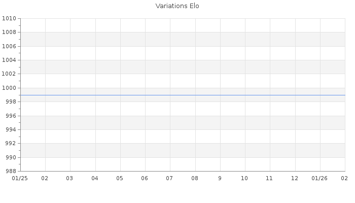 Date d'inscription : 12/01/25. Donateur pour EchecsEmail : Non ( Cliquez ici pour soutenir EchecsEmail. ) Elo non arrondi:973 ( 505 sur 459 joueurs ) Nombre de victoires :0 Nombre de nulles :0 Nombre de défaites :6 Temps de réponse moyen par coup : 1J 11H 12M 16S ( Moyenne sur 0 coups ). Rd ( Un petit rd indique un elo fiable ) : 230 Elo maximum atteint ( en étant classé ) :0 Elo maximum atteint cette année :0 Nombre coups joués : 34 Inscrit dans l' équipe:les fous de bassans Classement coupe : Inactif Points coupe : 0 Classement Coupe Magic Chess : Inactif Points Coupe Magic Chess : 0 Tournoi échelle : Nombre de tournois gagnés :0