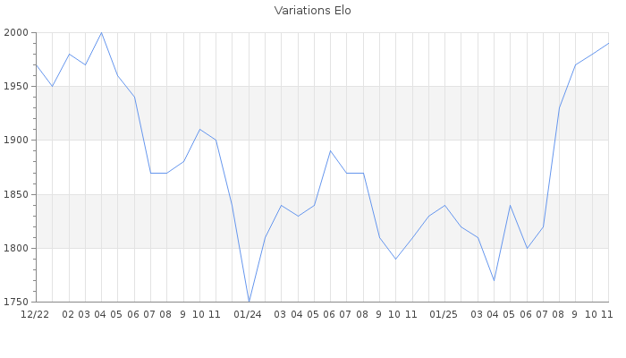 Date d'inscription : 21/04/07. Donateur pour EchecsEmail : Non ( Cliquez ici pour soutenir EchecsEmail. ) Elo non arrondi:1986.1 ( 129 sur 461 joueurs ) Nombre de victoires :996 Nombre de nulles :108 Nombre de défaites :918 Temps de réponse moyen par coup : 0J 10H 29M 46S ( Moyenne sur 390 coups ). Rd ( Un petit rd indique un elo fiable ) : 75 Magic Elo:1600 Magic Rd : 350 Elo maximum atteint ( en étant classé ) :2080 Elo maximum atteint cette année :1990 Nombre coups joués : 73497 Inscrit dans l' équipe:LA CITE ARDENTE Classement coupe : Inactif Points coupe : 0.03 Classement Coupe Magic Chess : Inactif Points Coupe Magic Chess : 0 Tournoi échelle : Inactif. Tournois gagnés : 30/09/2025 : Cat 4 : Victoire dans le tournoi n°27011 31/08/2025 : Cat 4 : Victoire dans le tournoi n°26979 08/08/2025 : Cat 4 : Victoire dans le tournoi n°26894 28/05/2025 : Cat 3 : Victoire dans le tournoi n°26746 21/01/2025 : Cat 3 : Victoire dans le tournoi n°26323 24/02/2024 : Cat 3 : Victoire dans le tournoi n°25564 05/04/2023 : Cat 4 : Victoire dans le tournoi n°24689 12/06/2022 : Cat 4 : Victoire dans le tournoi n°23950 12/05/2022 : Cat 4 : Victoire dans le tournoi n°23913 03/05/2022 : Cat 4 : Victoire dans le tournoi n°23764 12/03/2022 : Cat 4 : Victoire dans le tournoi n°23612 11/03/2022 : Cat 4 : Victoire dans le tournoi n°23524 14/02/2021 : Cat 4 : Victoire dans le tournoi n°22088 16/09/2020 : Cat 4 : Victoire dans le tournoi n°21703 29/08/2020 : Cat 4 : Victoire dans le tournoi n°21666 19/08/2020 : Cat 4 : Victoire dans le tournoi n°21579 08/08/2020 : Cat 4 : Victoire dans le tournoi n°21586 29/06/2020 : Cat 4 : Victoire dans le tournoi n°21256 08/04/2020 : Cat 3 : Victoire dans le tournoi n°20921 21/03/2020 : Cat 3 : Victoire dans le tournoi n°20824 01/03/2020 : Cat 3 : Victoire dans le tournoi n°20735 21/02/2020 : Cat 3 : Victoire dans le tournoi n°20791 27/01/2020 : Cat 3 : Victoire dans le tournoi n°20641 01/02/2018 : Cat 4 : Victoire dans le tournoi n°15955 18/05/2015 : Cat 3 : Victoire dans le tournoi n°17697 18/05/2015 : Cat 4 : Victoire dans le tournoi n°17185 12/03/2015 : Cat 3 : Victoire dans le tournoi n°17065 08/04/2014 : Cat 3 : Victoire dans le tournoi n°13842 19/02/2014 : Cat 4 : Victoire dans le tournoi n°14670 26/01/2014 : Cat 3 : Victoire dans le tournoi n°13832 28/02/2013 : Cat 3 : Victoire dans le tournoi n°11055 13/02/2013 : Cat 3 : Victoire dans le tournoi n°11134 31/01/2013 : Cat 4 : Victoire dans le tournoi n°11100 26/10/2012 : Cat 3 : Victoire dans le tournoi n°10858 02/10/2012 : Cat 3 : Victoire dans le tournoi n°10430 11/08/2011 : Cat 3 : Victoire dans le tournoi n°8638 08/02/2011 : Cat 3 : Victoire dans le tournoi n°7885 21/04/2010 : Cat 4 : Victoire dans le tournoi n°7026 09/12/2009 : Cat 2 : Victoire dans le tournoi n°6138 19/11/2009 : Cat 3 : Victoire dans le tournoi n°6392 14/10/2009 : Cat 3 : Victoire dans le tournoi n°6331 07/10/2009 : Cat 2 : Victoire dans le tournoi n°6356 27/09/2009 : Cat 3 : Victoire dans le tournoi n°6140 24/09/2009 : Cat 2 : Victoire dans le tournoi n°6154 19/09/2009 : Cat 2 : Victoire dans le tournoi n°5979 19/06/2009 : Cat 3 : Victoire dans le tournoi n°5770 17/06/2009 : Cat 3 : Victoire dans le tournoi n°5772 14/07/2008 : Cat 3 : Victoire dans le tournoi n°5123 Nombre de tournois gagnés :48