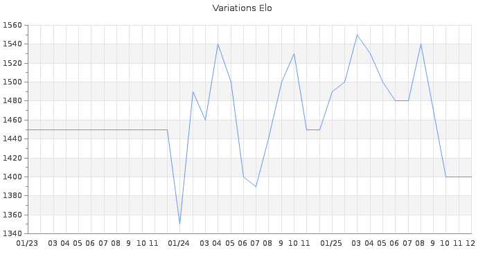 Date d'inscription : 29/07/21. Donateur pour EchecsEmail : Non ( Cliquez ici pour soutenir EchecsEmail. ) Elo non arrondi:1401.5 ( 412 sur 448 joueurs ) Nombre de victoires :481 Nombre de nulles :20 Nombre de défaites :424 Temps de réponse moyen par coup : 0J 8H 40M 56S ( Moyenne sur 864 coups ). Rd ( Un petit rd indique un elo fiable ) : 54 Magic Elo:1700 Magic Rd : 350 Elo maximum atteint ( en étant classé ) :1660 Elo maximum atteint cette année :1610 Nombre coups joués : 20080 Inscrit dans l' équipe:fouschess Classement coupe : 147 Points coupe : 10.56 Classement Coupe Magic Chess : Inactif Points Coupe Magic Chess : 0 Tournoi échelle : Inactif. Tournois gagnés : 17/09/2025 : Cat 1 : Victoire dans le tournoi n°26942 11/09/2025 : Cat 2 : Victoire dans le tournoi n°27043 04/09/2025 : Cat 1 : Victoire dans le tournoi n°26933 29/08/2025 : Cat 2 : Victoire dans le tournoi n°26991 20/08/2025 : Cat 1 : Victoire dans le tournoi n°26963 19/08/2025 : Cat 1 : Victoire dans le tournoi n°26936 03/08/2025 : Cat 1 : Victoire dans le tournoi n°26910 19/07/2025 : Cat 1 : Victoire dans le tournoi n°26895 17/07/2025 : Cat 2 : Victoire dans le tournoi n°26699 10/07/2025 : Cat 1 : Victoire dans le tournoi n°26782 18/04/2025 : Cat 1 : Victoire dans le tournoi n°26611 29/03/2025 : Cat 2 : Victoire dans le tournoi n°26602 27/03/2025 : Cat 1 : Victoire dans le tournoi n°26582 14/03/2025 : Cat 1 : Victoire dans le tournoi n°26547 13/03/2025 : Cat 1 : Victoire dans le tournoi n°26421 05/03/2025 : Cat 1 : Victoire dans le tournoi n°26472 09/02/2025 : Cat 1 : Victoire dans le tournoi n°26459 27/01/2025 : Cat 1 : Victoire dans le tournoi n°26432 21/10/2024 : Cat 1 : Victoire dans le tournoi n°26105 20/10/2024 : Cat 1 : Victoire dans le tournoi n°26042 01/10/2024 : Cat 2 : Victoire dans le tournoi n°26063 23/09/2024 : Cat 1 : Victoire dans le tournoi n°25968 05/09/2024 : Cat 1 : Victoire dans le tournoi n°25981 05/06/2024 : Cat 2 : Victoire dans le tournoi n°25725 14/05/2024 : Cat 1 : Victoire dans le tournoi n°25589 05/04/2024 : Cat 1 : Victoire dans le tournoi n°25653 27/03/2024 : Cat 1 : Victoire dans le tournoi n°25637 14/03/2024 : Cat 1 : Victoire dans le tournoi n°25641 06/03/2024 : Cat 1 : Victoire dans le tournoi n°25601 03/03/2024 : Cat 1 : Victoire dans le tournoi n°25614 18/02/2024 : Cat 1 : Victoire dans le tournoi n°25586 05/11/2022 : Cat 2 : Victoire dans le tournoi n°24373 31/10/2022 : Cat 2 : Victoire dans le tournoi n°24359 23/01/2022 : Cat 2 : Victoire dans le tournoi n°23558 21/01/2022 : Cat 2 : Victoire dans le tournoi n°23422 10/01/2022 : Cat 2 : Victoire dans le tournoi n°23468 10/01/2022 : Cat 2 : Victoire dans le tournoi n°23431 21/09/2021 : Cat 2 : Victoire dans le tournoi n°23094 30/08/2021 : Cat 1 : Victoire dans le tournoi n°23057 24/08/2021 : Cat 1 : Victoire dans le tournoi n°23078 Nombre de tournois gagnés :40