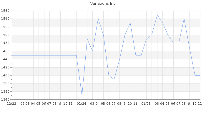 Date d'inscription : 29/07/21. Donateur pour EchecsEmail : Non ( Cliquez ici pour soutenir EchecsEmail. ) Elo non arrondi:1401.5 ( 412 sur 448 joueurs ) Nombre de victoires :481 Nombre de nulles :20 Nombre de défaites :424 Temps de réponse moyen par coup : 0J 8H 40M 56S ( Moyenne sur 777 coups ). Rd ( Un petit rd indique un elo fiable ) : 54 Magic Elo:1700 Magic Rd : 350 Elo maximum atteint ( en étant classé ) :1660 Elo maximum atteint cette année :1610 Nombre coups joués : 20080 Inscrit dans l' équipe:fouschess Classement coupe : 147 Points coupe : 10.56 Classement Coupe Magic Chess : Inactif Points Coupe Magic Chess : 0 Tournoi échelle : Inactif. Tournois gagnés : 17/09/2025 : Cat 1 : Victoire dans le tournoi n°26942 11/09/2025 : Cat 2 : Victoire dans le tournoi n°27043 04/09/2025 : Cat 1 : Victoire dans le tournoi n°26933 29/08/2025 : Cat 2 : Victoire dans le tournoi n°26991 20/08/2025 : Cat 1 : Victoire dans le tournoi n°26963 19/08/2025 : Cat 1 : Victoire dans le tournoi n°26936 03/08/2025 : Cat 1 : Victoire dans le tournoi n°26910 19/07/2025 : Cat 1 : Victoire dans le tournoi n°26895 17/07/2025 : Cat 2 : Victoire dans le tournoi n°26699 10/07/2025 : Cat 1 : Victoire dans le tournoi n°26782 18/04/2025 : Cat 1 : Victoire dans le tournoi n°26611 29/03/2025 : Cat 2 : Victoire dans le tournoi n°26602 27/03/2025 : Cat 1 : Victoire dans le tournoi n°26582 14/03/2025 : Cat 1 : Victoire dans le tournoi n°26547 13/03/2025 : Cat 1 : Victoire dans le tournoi n°26421 05/03/2025 : Cat 1 : Victoire dans le tournoi n°26472 09/02/2025 : Cat 1 : Victoire dans le tournoi n°26459 27/01/2025 : Cat 1 : Victoire dans le tournoi n°26432 21/10/2024 : Cat 1 : Victoire dans le tournoi n°26105 20/10/2024 : Cat 1 : Victoire dans le tournoi n°26042 01/10/2024 : Cat 2 : Victoire dans le tournoi n°26063 23/09/2024 : Cat 1 : Victoire dans le tournoi n°25968 05/09/2024 : Cat 1 : Victoire dans le tournoi n°25981 05/06/2024 : Cat 2 : Victoire dans le tournoi n°25725 14/05/2024 : Cat 1 : Victoire dans le tournoi n°25589 05/04/2024 : Cat 1 : Victoire dans le tournoi n°25653 27/03/2024 : Cat 1 : Victoire dans le tournoi n°25637 14/03/2024 : Cat 1 : Victoire dans le tournoi n°25641 06/03/2024 : Cat 1 : Victoire dans le tournoi n°25601 03/03/2024 : Cat 1 : Victoire dans le tournoi n°25614 18/02/2024 : Cat 1 : Victoire dans le tournoi n°25586 05/11/2022 : Cat 2 : Victoire dans le tournoi n°24373 31/10/2022 : Cat 2 : Victoire dans le tournoi n°24359 23/01/2022 : Cat 2 : Victoire dans le tournoi n°23558 21/01/2022 : Cat 2 : Victoire dans le tournoi n°23422 10/01/2022 : Cat 2 : Victoire dans le tournoi n°23468 10/01/2022 : Cat 2 : Victoire dans le tournoi n°23431 21/09/2021 : Cat 2 : Victoire dans le tournoi n°23094 30/08/2021 : Cat 1 : Victoire dans le tournoi n°23057 24/08/2021 : Cat 1 : Victoire dans le tournoi n°23078 Nombre de tournois gagnés :40
