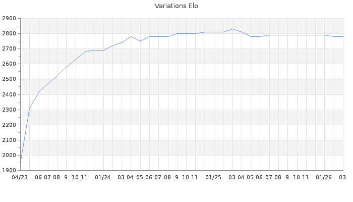 Date d'inscription : 02/04/23. Donateur pour EchecsEmail : Non ( Cliquez ici pour soutenir EchecsEmail. ) Elo non arrondi:2779 ( 7 sur 440 joueurs ) Nombre de victoires :48 Nombre de nulles :61 Nombre de défaites :2 Temps de réponse moyen par coup : 0J 19H 0M 19S ( Moyenne sur 271 coups ). Rd ( Un petit rd indique un elo fiable ) : 78 Elo maximum atteint ( en étant classé ) :2830 Elo maximum atteint cette année :2780 Nombre coups joués : 4329 Inscrit dans l' équipe:Les Rois du Succes Classement coupe : Inactif Points coupe : 0 Classement Coupe Magic Chess : Inactif Points Coupe Magic Chess : 0 Tournoi échelle : Nombre de tournois gagnés :0