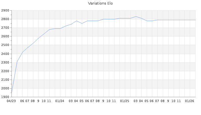 Date d'inscription : 02/04/23. Donateur pour EchecsEmail : Non ( Cliquez ici pour soutenir EchecsEmail. ) Elo non arrondi:2785.4 ( 6 sur 463 joueurs ) Nombre de victoires :48 Nombre de nulles :52 Nombre de défaites :2 Temps de réponse moyen par coup : 0J 16H 20M 52S ( Moyenne sur 181 coups ). Rd ( Un petit rd indique un elo fiable ) : 82 Elo maximum atteint ( en étant classé ) :2830 Elo maximum atteint cette année :0 Nombre coups joués : 4055 Inscrit dans l' équipe:Les Rois du Succes Classement coupe : Inactif Points coupe : 0 Classement Coupe Magic Chess : Inactif Points Coupe Magic Chess : 0 Tournoi échelle : Nombre de tournois gagnés :0
