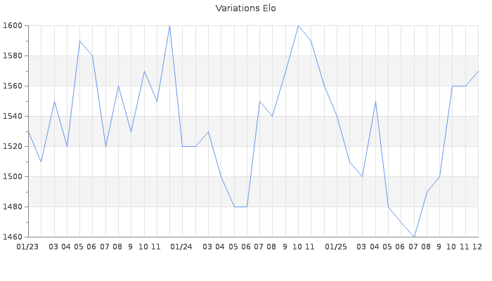 Date d'inscription : 22/02/08. Donateur pour EchecsEmail : Non ( Cliquez ici pour soutenir EchecsEmail. ) Elo non arrondi:1562.8 ( 347 sur 452 joueurs ) Nombre de victoires :497 Nombre de nulles :49 Nombre de défaites :824 Temps de réponse moyen par coup : 0J 6H 48M 37S ( Moyenne sur 608 coups ). Rd ( Un petit rd indique un elo fiable ) : 65 Magic Elo:1670.42 Magic Rd : 199 Elo maximum atteint ( en étant classé ) :1900 Elo maximum atteint cette année :1580 Nombre coups joués : 57470 Inscrit dans l' équipe:O fou d hello Classement coupe : Inactif Points coupe : 0 Classement Coupe Magic Chess : Inactif Points Coupe Magic Chess : 0 Tournoi échelle : Inactif. Tournois gagnés : 05/11/2025 : Cat 2 : Victoire dans le tournoi n°27166 20/10/2025 : Cat 2 : Victoire dans le tournoi n°27110 09/08/2025 : Cat 2 : Victoire dans le tournoi n°26930 23/04/2025 : Cat 2 : Victoire dans le tournoi n°26641 26/08/2024 : Cat 2 : Victoire dans le tournoi n°25913 03/01/2024 : Cat 2 : Victoire dans le tournoi n°25438 16/10/2023 : Cat 2 : Victoire dans le tournoi n°25259 15/06/2023 : Cat 2 : Victoire dans le tournoi n°24918 07/08/2015 : Cat 2 : Victoire dans le tournoi n°17957 15/09/2014 : Cat 2 : Victoire dans le tournoi n°15799 04/03/2014 : Cat 1 : Victoire dans le tournoi n°14632 25/10/2012 : Cat 2 : Victoire dans le tournoi n°10704 02/10/2010 : Cat 2 : Victoire dans le tournoi n°7779 23/06/2009 : Cat 2 : Victoire dans le tournoi n°5923 31/03/2009 : Cat 2 : Victoire dans le tournoi n°5488 Nombre de tournois gagnés :15