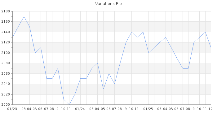 Date d'inscription : 24/09/15. Donateur pour EchecsEmail : Oui ( Cliquez ici pour soutenir EchecsEmail. ) Elo non arrondi:2113.8 ( 86 sur 458 joueurs ) Nombre de victoires :668 Nombre de nulles :78 Nombre de défaites :520 Temps de réponse moyen par coup : 0J 16H 39M 28S ( Moyenne sur 209 coups ). Rd ( Un petit rd indique un elo fiable ) : 88 Magic Elo:1691.88 Magic Rd : 153 Elo maximum atteint ( en étant classé ) :2200 Elo maximum atteint cette année :2140 Nombre coups joués : 44002 Inscrit dans l' équipe:Vikings Classement coupe : Inactif Points coupe : 0.18 Classement Coupe Magic Chess : Inactif Points Coupe Magic Chess : 0 Tournoi échelle : Inactif. Tournois gagnés : 10/09/2018 : Cat 4 : Victoire dans le tournoi n°18556 15/05/2018 : Cat 5 : Victoire dans le tournoi n°17835 05/03/2018 : Cat 4 : Victoire dans le tournoi n°17565 13/02/2017 : Cat 4 : Victoire dans le tournoi n°15963 08/02/2017 : Cat 4 : Victoire dans le tournoi n°16047 04/02/2017 : Cat 4 : Victoire dans le tournoi n°16084 10/11/2016 : Cat 4 : Victoire dans le tournoi n°15344 11/10/2016 : Cat 4 : Victoire dans le tournoi n°15509 29/09/2016 : Cat 4 : Victoire dans le tournoi n°15381 29/07/2016 : Cat 4 : Victoire dans le tournoi n°15109 12/02/2016 : Cat 3 : Victoire dans le tournoi n°14156 22/01/2016 : Cat 3 : Victoire dans le tournoi n°14025 01/12/2015 : Cat 3 : Victoire dans le tournoi n°18845 01/12/2015 : Cat 3 : Victoire dans le tournoi n°18841 Nombre de tournois gagnés :14