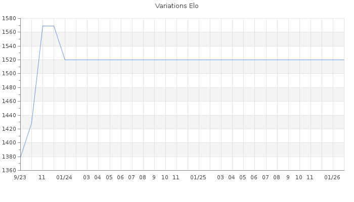 Date d'inscription : 14/09/23. Donateur pour EchecsEmail : Non ( Cliquez ici pour soutenir EchecsEmail. ) Elo non arrondi:1484.8 ( 417 sur 450 joueurs ) Nombre de victoires :4 Nombre de nulles :1 Nombre de défaites :7 Temps de réponse moyen par coup : 0J 2H 58M 25S ( Moyenne sur 0 coups ). Rd ( Un petit rd indique un elo fiable ) : 128 Elo maximum atteint ( en étant classé ) :1540 Elo maximum atteint cette année :0 Nombre coups joués : 356 Classement coupe : Inactif Points coupe : 0 Classement Coupe Magic Chess : Inactif Points Coupe Magic Chess : 0 Tournoi échelle : Nombre de tournois gagnés :0