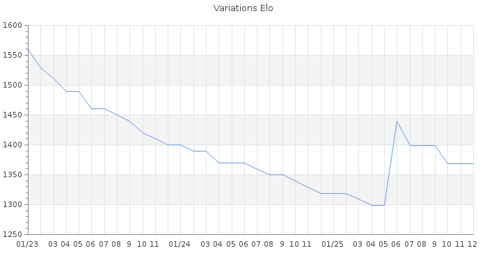 Date d'inscription : 07/04/20. Donateur pour EchecsEmail : Non ( Cliquez ici pour soutenir EchecsEmail. ) Elo non arrondi:1371.9 ( 408 sur 448 joueurs ) Nombre de victoires :3 Nombre de nulles :0 Nombre de défaites :30 Temps de réponse moyen par coup : 1J 0H 15M 7S ( Moyenne sur 50 coups ). Rd ( Un petit rd indique un elo fiable ) : 156 Elo maximum atteint ( en étant classé ) :1510 Elo maximum atteint cette année :0 Nombre coups joués : 855 Classement coupe : Inactif Points coupe : 0 Classement Coupe Magic Chess : Inactif Points Coupe Magic Chess : 0 Tournoi échelle : Nombre de tournois gagnés :0