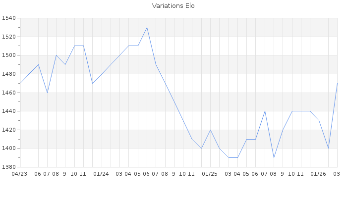 Date d'inscription : 06/02/21. Donateur pour EchecsEmail : Non ( Cliquez ici pour soutenir EchecsEmail. ) Elo non arrondi:1470.3 ( 370 sur 444 joueurs ) Nombre de victoires :107 Nombre de nulles :3 Nombre de défaites :134 Temps de réponse moyen par coup : 0J 3H 40M 23S ( Moyenne sur 370 coups ). Rd ( Un petit rd indique un elo fiable ) : 74 Elo maximum atteint ( en étant classé ) :1580 Elo maximum atteint cette année :1490 Nombre coups joués : 9300 Classement coupe : Inactif Points coupe : 0 Classement Coupe Magic Chess : Inactif Points Coupe Magic Chess : 0 Tournoi échelle : Nombre de tournois gagnés :0