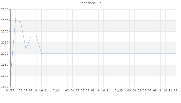 Date d'inscription : 16/04/23. Donateur pour EchecsEmail : Non ( Cliquez ici pour soutenir EchecsEmail. ) Elo non arrondi:1966.6 ( 114 sur 449 joueurs ) Nombre de victoires :38 Nombre de nulles :6 Nombre de défaites :23 Temps de réponse moyen par coup : 0J 21H 58M 2S ( Moyenne sur 0 coups ). Rd ( Un petit rd indique un elo fiable ) : 70 Magic Elo:1700 Magic Rd : 350 Elo maximum atteint ( en étant classé ) :2170 Elo maximum atteint cette année :0 Nombre coups joués : 1793 Classement coupe : Inactif, date de la dernière qualification : 08/08/23 Points coupe : 53.14 Classement Coupe Magic Chess : Inactif Points Coupe Magic Chess : 0 Tournoi échelle : Inactif. Tournois gagnés : 18/06/2023 : Cat 4 : Victoire dans le tournoi n°24899 17/05/2023 : Cat 4 : Victoire dans le tournoi n°24846 Nombre de tournois gagnés :2