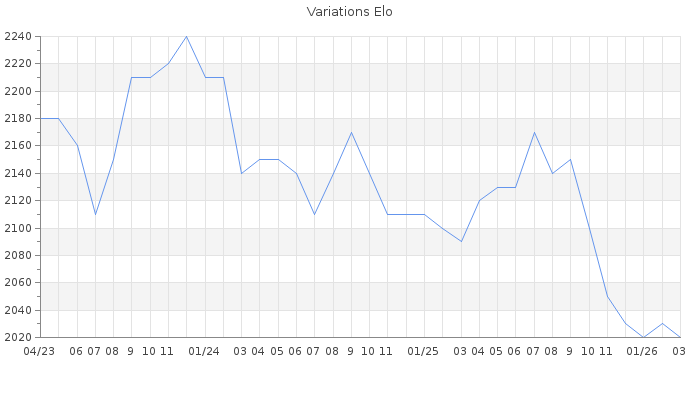 Date d'inscription : 06/08/16. Donateur pour EchecsEmail : Non ( Cliquez ici pour soutenir EchecsEmail. ) Elo non arrondi:2018.3 ( 119 sur 444 joueurs ) Nombre de victoires :340 Nombre de nulles :94 Nombre de défaites :163 Temps de réponse moyen par coup : 0J 18H 27M 36S ( Moyenne sur 131 coups ). Rd ( Un petit rd indique un elo fiable ) : 87 Magic Elo:1600 Magic Rd : 350 Elo maximum atteint ( en étant classé ) :2480 Elo maximum atteint cette année :2030 Nombre coups joués : 21067 Classement coupe : Inactif Points coupe : 0 Classement Coupe Magic Chess : Inactif Points Coupe Magic Chess : 0 Tournoi échelle : Tournois gagnés : 18/11/2016 : Cat 5 : Victoire dans le tournoi n°15307 16/08/2016 : Cat 4 : Victoire dans le tournoi n°15272 Nombre de tournois gagnés :2