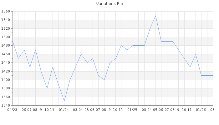 Date d'inscription : 30/08/10. Donateur pour EchecsEmail : Non ( Cliquez ici pour soutenir EchecsEmail. ) Elo non arrondi:1408.8 ( 391 sur 447 joueurs ) Nombre de victoires :272 Nombre de nulles :26 Nombre de défaites :438 Temps de réponse moyen par coup : 0J 5H 3M 40S ( Moyenne sur 445 coups ). Rd ( Un petit rd indique un elo fiable ) : 71 Magic Elo:1600 Magic Rd : 350 Elo maximum atteint ( en étant classé ) :1660 Elo maximum atteint cette année :1460 Nombre coups joués : 27909 Inscrit dans l' équipe:La Diagonale du Fou Classement coupe : Inactif Points coupe : 0 Classement Coupe Magic Chess : Inactif Points Coupe Magic Chess : 0 Tournoi échelle : Tournois gagnés : 09/07/2022 : Cat 2 : Victoire dans le tournoi n°23986 18/04/2020 : Premier dans le Ch. 2019 : Division 2A 24/03/2020 : Cat 1 : Victoire dans le tournoi n°20613 Nombre de tournois gagnés :2