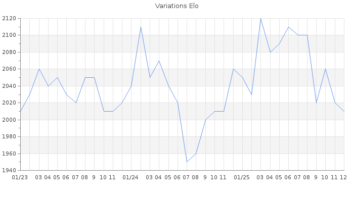 Date d'inscription : 02/02/06. Donateur pour EchecsEmail : Oui ( Cliquez ici pour soutenir EchecsEmail. ) Elo non arrondi:2011.6 ( 122 sur 460 joueurs ) Nombre de victoires :1647 Nombre de nulles :493 Nombre de défaites :1120 Temps de réponse moyen par coup : 0J 4H 42M 25S ( Moyenne sur 2597 coups ). Rd ( Un petit rd indique un elo fiable ) : 52 Magic Elo:1600 Magic Rd : 350 Elo maximum atteint ( en étant classé ) :2140 Elo maximum atteint cette année :2130 Nombre coups joués : 118974 Inscrit dans l' équipe:Mission Impossible Classement coupe : Inactif Points coupe : 0 Classement Coupe Magic Chess : Inactif Points Coupe Magic Chess : 0 Tournoi échelle : Inactif. Tournois gagnés : 30/11/2025 : Cat 4 : Victoire dans le tournoi n°27143 24/11/2025 : Cat 4 : Victoire dans le tournoi n°27192 02/11/2025 : Cat 4 : Victoire dans le tournoi n°27139 16/09/2025 : Cat 5 : Victoire dans le tournoi n°26892 15/09/2025 : Cat 4 : Victoire dans le tournoi n°27042 19/07/2025 : Cat 5 : Victoire dans le tournoi n°26871 16/07/2025 : Cat 4 : Victoire dans le tournoi n°26879 12/07/2025 : Cat 4 : Victoire dans le tournoi n°26875 29/05/2025 : Cat 4 : Victoire dans le tournoi n°26694 22/05/2025 : Cat 5 : Victoire dans le tournoi n°26652 18/04/2025 : Cat 5 : Victoire dans le tournoi n°26559 24/03/2025 : Cat 4 : Victoire dans le tournoi n°26575 24/03/2025 : Cat 4 : Victoire dans le tournoi n°26577 10/03/2025 : Cat 4 : Victoire dans le tournoi n°26586 27/01/2025 : Cat 4 : Victoire dans le tournoi n°26358 22/12/2024 : Cat 4 : Victoire dans le tournoi n°26350 15/12/2024 : Cat 4 : Victoire dans le tournoi n°26110 10/10/2024 : Cat 4 : Victoire dans le tournoi n°25976 04/10/2024 : Cat 4 : Victoire dans le tournoi n°26066 08/09/2024 : Cat 4 : Victoire dans le tournoi n°26046 07/09/2024 : Cat 4 : Victoire dans le tournoi n°26017 07/04/2024 : Cat 4 : Victoire dans le tournoi n°25573 14/03/2024 : Cat 4 : Victoire dans le tournoi n°25602 15/02/2024 : Cat 4 : Victoire dans le tournoi n°25571 08/02/2024 : Cat 4 : Victoire dans le tournoi n°25559 07/02/2024 : Cat 4 : Victoire dans le tournoi n°25509 02/02/2024 : Cat 4 : Victoire dans le tournoi n°25495 12/12/2023 : Cat 4 : Victoire dans le tournoi n°25300 06/09/2023 : Cat 4 : Victoire dans le tournoi n°25133 24/07/2023 : Cat 4 : Victoire dans le tournoi n°25023 24/06/2023 : Cat 4 : Victoire dans le tournoi n°24962 13/06/2023 : Cat 4 : Victoire dans le tournoi n°24864 28/02/2023 : Cat 4 : Victoire dans le tournoi n°24636 07/10/2022 : Cat 4 : Victoire dans le tournoi n°24263 22/05/2022 : Cat 4 : Victoire dans le tournoi n°23889 07/05/2022 : Cat 4 : Victoire dans le tournoi n°23869 30/04/2022 : Cat 4 : Victoire dans le tournoi n°23811 28/01/2022 : Cat 4 : Victoire dans le tournoi n°23502 25/01/2022 : Cat 4 : Victoire dans le tournoi n°23580 10/09/2021 : Cat 4 : Victoire dans le tournoi n°23083 02/09/2021 : Cat 4 : Victoire dans le tournoi n°22880 27/08/2021 : Cat 4 : Victoire dans le tournoi n°23043 25/08/2021 : Cat 4 : Victoire dans le tournoi n°22977 24/07/2021 : Cat 4 : Victoire dans le tournoi n°22749 07/05/2021 : Cat 4 : Victoire dans le tournoi n°22729 01/04/2021 : Cat 4 : Victoire dans le tournoi n°22321 22/03/2021 : Cat 4 : Victoire dans le tournoi n°22519 25/02/2021 : Cat 4 : Victoire dans le tournoi n°22310 09/01/2021 : Cat 4 : Victoire dans le tournoi n°22209 22/12/2020 : Cat 4 : Victoire dans le tournoi n°22117 08/11/2020 : Cat 4 : Victoire dans le tournoi n°21861 14/10/2020 : Cat 4 : Victoire dans le tournoi n°21699 19/08/2020 : Cat 4 : Victoire dans le tournoi n°21645 04/07/2020 : Cat 4 : Victoire dans le tournoi n°21175 27/03/2020 : Cat 4 : Victoire dans le tournoi n°20565 31/08/2019 : Cat 4 : Victoire dans le tournoi n°19734 09/07/2019 : Cat 4 : Victoire dans le tournoi n°19660 07/02/2019 : Cat 5 : Victoire dans le tournoi n°18994 08/11/2018 : Cat 4 : Victoire dans le tournoi n°18444 30/06/2018 : Cat 4 : Victoire dans le tournoi n°17786 05/12/2017 : Cat 5 : Victoire dans le tournoi n°17055 26/03/2017 : Cat 4 : Victoire dans le tournoi n°16152 22/03/2017 : Cat 3 : Victoire dans le tournoi n°16209 15/03/2017 : Cat 3 : Victoire dans le tournoi n°16207 14/01/2017 : Cat 3 : Victoire dans le tournoi n°15605 24/11/2016 : Cat 3 : Victoire dans le tournoi n°15580 19/07/2016 : Cat 3 : Victoire dans le tournoi n°15073 06/07/2016 : Cat 3 : Victoire dans le tournoi n°15063 01/07/2016 : Cat 3 : Victoire dans le tournoi n°15010 28/06/2016 : Cat 3 : Victoire dans le tournoi n°14957 08/06/2016 : Cat 4 : Victoire dans le tournoi n°14787 09/05/2016 : Cat 4 : Victoire dans le tournoi n°14783 12/04/2016 : Cat 3 : Victoire dans le tournoi n°14498 31/03/2016 : Cat 4 : Victoire dans le tournoi n°14542 26/03/2016 : Cat 3 : Victoire dans le tournoi n°14435 09/03/2016 : Cat 4 : Victoire dans le tournoi n°14499 27/02/2016 : Cat 3 : Victoire dans le tournoi n°14418 04/12/2015 : Cat 3 : Victoire dans le tournoi n°18424 24/09/2015 : Cat 3 : Victoire dans le tournoi n°18384 18/07/2015 : Cat 3 : Victoire dans le tournoi n°17951 30/01/2015 : Cat 4 : Victoire dans le tournoi n°16801 23/01/2015 : Cat 3 : Victoire dans le tournoi n°16824 18/01/2015 : Cat 4 : Victoire dans le tournoi n°16795 19/12/2014 : Cat 3 : Victoire dans le tournoi n°16633 11/12/2014 : Cat 3 : Victoire dans le tournoi n°16541 19/11/2014 : Cat 3 : Victoire dans le tournoi n°16237 02/09/2014 : Cat 3 : Victoire dans le tournoi n°15549 09/08/2014 : Cat 3 : Victoire dans le tournoi n°15577 29/06/2014 : Cat 3 : Victoire dans le tournoi n°15536 24/12/2013 : Cat 4 : Victoire dans le tournoi n°13833 01/11/2013 : Cat 3 : Victoire dans le tournoi n°13731 01/11/2013 : Cat 3 : Victoire dans le tournoi n°13715 25/10/2013 : Cat 3 : Victoire dans le tournoi n°13713 02/02/2013 : Cat 4 : Victoire dans le tournoi n°11332 26/12/2012 : Cat 4 : Victoire dans le tournoi n°11436 08/01/2011 : Cat 3 : Victoire dans le tournoi n°7870 17/11/2010 : Cat 3 : Vi