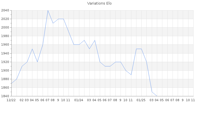 Date d'inscription : 22/08/12. Donateur pour EchecsEmail : Non ( Cliquez ici pour soutenir EchecsEmail. ) Elo non arrondi:1819.2 ( 223 sur 461 joueurs ) Nombre de victoires :1736 Nombre de nulles :559 Nombre de défaites :1841 Temps de réponse moyen par coup : 0J 10H 30M 37S ( Moyenne sur 30 coups ). Rd ( Un petit rd indique un elo fiable ) : 63 Magic Elo:1291.14 Magic Rd : 102 Elo maximum atteint ( en étant classé ) :2090 Elo maximum atteint cette année :1950 Nombre coups joués : 179414 Inscrit dans l' équipe:les fous de bassans Classement coupe : 111 Points coupe : 59.36 Classement Coupe Magic Chess : Inactif Points Coupe Magic Chess : 0 Tournoi échelle : Inactif. Tournois gagnés : 28/01/2021 : Cat 4 : Victoire dans le tournoi n°22095 06/08/2019 : Cat 3 : Victoire CC Juil19 Asc 25/11/2018 : Cat 3 : Victoire CC Nov18 Asc 07/07/2018 : Cat 4 : Victoire dans le tournoi n°18315 03/09/2015 : Cat 0 : Premier au tournoi multi Eté 2015 n°12 25/09/2014 : Cat 4 : Victoire dans le tournoi n°16100 29/12/2013 : Cat 4 : Victoire dans le tournoi n°13592 04/12/2013 : Cat 4 : Victoire dans le tournoi n°13605 08/11/2013 : Cat 4 : Victoire dans le tournoi n°12984 23/10/2013 : Cat 4 : Victoire dans le tournoi n°12874 22/09/2013 : Cat 4 : Victoire dans le tournoi n°13411 26/06/2013 : Cat 4 : Victoire dans le tournoi n°12825 19/12/2012 : Cat 4 : Victoire dans le tournoi n°11392 Nombre de tournois gagnés :13