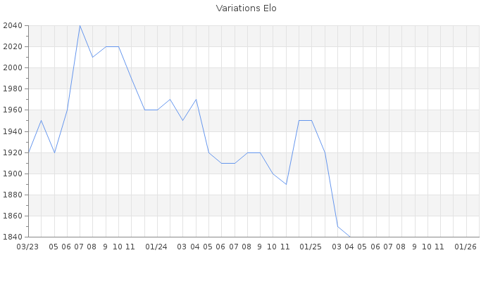 Date d'inscription : 22/08/12. Donateur pour EchecsEmail : Non ( Cliquez ici pour soutenir EchecsEmail. ) Elo non arrondi:1816.2 ( 223 sur 463 joueurs ) Nombre de victoires :1736 Nombre de nulles :559 Nombre de défaites :1841 Temps de réponse moyen par coup : 0J 10H 30M 37S ( Moyenne sur 9 coups ). Rd ( Un petit rd indique un elo fiable ) : 63 Magic Elo:1291.14 Magic Rd : 102 Elo maximum atteint ( en étant classé ) :2090 Elo maximum atteint cette année :0 Nombre coups joués : 179414 Inscrit dans l' équipe:les fous de bassans Classement coupe : 109 Points coupe : 50.89 Classement Coupe Magic Chess : Inactif Points Coupe Magic Chess : 0 Tournoi échelle : Inactif. Tournois gagnés : 28/01/2021 : Cat 4 : Victoire dans le tournoi n°22095 06/08/2019 : Cat 3 : Victoire CC Juil19 Asc 25/11/2018 : Cat 3 : Victoire CC Nov18 Asc 07/07/2018 : Cat 4 : Victoire dans le tournoi n°18315 03/09/2015 : Cat 0 : Premier au tournoi multi Eté 2015 n°12 25/09/2014 : Cat 4 : Victoire dans le tournoi n°16100 29/12/2013 : Cat 4 : Victoire dans le tournoi n°13592 04/12/2013 : Cat 4 : Victoire dans le tournoi n°13605 08/11/2013 : Cat 4 : Victoire dans le tournoi n°12984 23/10/2013 : Cat 4 : Victoire dans le tournoi n°12874 22/09/2013 : Cat 4 : Victoire dans le tournoi n°13411 26/06/2013 : Cat 4 : Victoire dans le tournoi n°12825 19/12/2012 : Cat 4 : Victoire dans le tournoi n°11392 Nombre de tournois gagnés :13