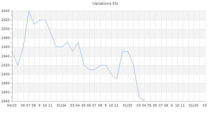 Date d'inscription : 22/08/12. Donateur pour EchecsEmail : Non ( Cliquez ici pour soutenir EchecsEmail. ) Elo non arrondi:1811.2 ( 223 sur 440 joueurs ) Nombre de victoires :1736 Nombre de nulles :559 Nombre de défaites :1841 Temps de réponse moyen par coup : 0J 10H 30M 37S ( Moyenne sur 4 coups ). Rd ( Un petit rd indique un elo fiable ) : 63 Magic Elo:1291.14 Magic Rd : 102 Elo maximum atteint ( en étant classé ) :2090 Elo maximum atteint cette année :0 Nombre coups joués : 179414 Inscrit dans l' équipe:les fous de bassans Classement coupe : 105 Points coupe : 48.35 Classement Coupe Magic Chess : Inactif Points Coupe Magic Chess : 0 Tournoi échelle : Inactif. Tournois gagnés : 28/01/2021 : Cat 4 : Victoire dans le tournoi n°22095 06/08/2019 : Cat 3 : Victoire CC Juil19 Asc 25/11/2018 : Cat 3 : Victoire CC Nov18 Asc 07/07/2018 : Cat 4 : Victoire dans le tournoi n°18315 03/09/2015 : Cat 0 : Premier au tournoi multi Eté 2015 n°12 25/09/2014 : Cat 4 : Victoire dans le tournoi n°16100 29/12/2013 : Cat 4 : Victoire dans le tournoi n°13592 04/12/2013 : Cat 4 : Victoire dans le tournoi n°13605 08/11/2013 : Cat 4 : Victoire dans le tournoi n°12984 23/10/2013 : Cat 4 : Victoire dans le tournoi n°12874 22/09/2013 : Cat 4 : Victoire dans le tournoi n°13411 26/06/2013 : Cat 4 : Victoire dans le tournoi n°12825 19/12/2012 : Cat 4 : Victoire dans le tournoi n°11392 Nombre de tournois gagnés :13