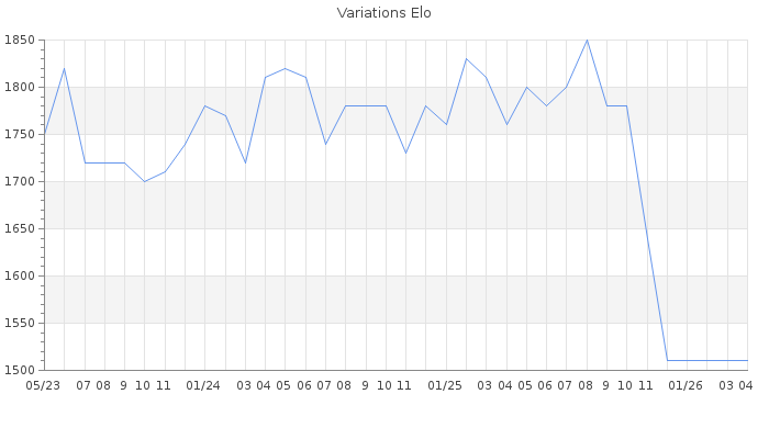 Date d'inscription : 20/01/18. Donateur pour EchecsEmail : Non ( Cliquez ici pour soutenir EchecsEmail. ) Elo non arrondi:1503.8 ( 352 sur 446 joueurs ) Nombre de victoires :5063 Nombre de nulles :395 Nombre de défaites :4214 Temps de réponse moyen par coup : 0J 1H 21M 52S ( Moyenne sur 1213 coups ). Rd ( Un petit rd indique un elo fiable ) : 51 Magic Elo:1310.91 Magic Rd : 170 Elo maximum atteint ( en étant classé ) :2020 Elo maximum atteint cette année :0 Nombre coups joués : 313555 Classement coupe : Inactif Points coupe : 0.02 Classement Coupe Magic Chess : Inactif Points Coupe Magic Chess : 0 Tournoi échelle : Inactif. Tournois gagnés : 23/11/2025 : Cat 3 : Victoire dans le tournoi n°27214 09/10/2025 : Cat 3 : Victoire dans le tournoi n°27036 06/10/2025 : Cat 3 : Victoire dans le tournoi n°27077 04/10/2025 : Cat 3 : Victoire dans le tournoi n°27103 24/09/2025 : Cat 3 : Victoire dans le tournoi n°27063 10/09/2025 : Cat 3 : Victoire dans le tournoi n°26969 02/09/2025 : Cat 3 : Victoire dans le tournoi n°26937 01/09/2025 : Cat 3 : Victoire dans le tournoi n°26976 28/08/2025 : Cat 3 : Victoire dans le tournoi n°26814 02/08/2025 : Cat 3 : Victoire dans le tournoi n°26917 02/08/2025 : Cat 3 : Victoire dans le tournoi n°26878 25/07/2025 : Cat 3 : Victoire dans le tournoi n°26899 23/07/2025 : Cat 3 : Victoire dans le tournoi n°26805 26/06/2025 : Cat 3 : Victoire dans le tournoi n°26823 19/06/2025 : Cat 3 : Victoire dans le tournoi n°26795 09/06/2025 : Cat 3 : Victoire dans le tournoi n°26712 02/06/2025 : Cat 3 : Victoire dans le tournoi n°26776 01/05/2025 : Cat 3 : Victoire dans le tournoi n°26663 15/04/2025 : Cat 3 : Victoire dans le tournoi n°26673 26/03/2025 : Cat 3 : Victoire dans le tournoi n°26548 22/03/2025 : Cat 3 : Victoire dans le tournoi n°26558 12/03/2025 : Cat 3 : Victoire dans le tournoi n°26531 11/03/2025 : Cat 3 : Victoire dans le tournoi n°26520 25/02/2025 : Cat 3 : Victoire dans le tournoi n°26534 12/02/2025 : Cat 3 : Victoire dans le tournoi n°26425 05/02/2025 : Cat 3 : Victoire dans le tournoi n°26436 26/12/2024 : Cat 3 : Victoire dans le tournoi n°26287 10/12/2024 : Cat 3 : Victoire dans le tournoi n°26121 29/11/2024 : Cat 3 : Victoire dans le tournoi n°26195 12/11/2024 : Cat 3 : Victoire dans le tournoi n°26124 03/11/2024 : Cat 3 : Victoire dans le tournoi n°26080 29/10/2024 : Cat 3 : Victoire dans le tournoi n°26012 28/10/2024 : Cat 3 : Victoire dans le tournoi n°26171 30/09/2024 : Cat 3 : Victoire dans le tournoi n°26112 25/09/2024 : Cat 3 : Victoire dans le tournoi n°26094 18/08/2024 : Cat 3 : Victoire dans le tournoi n°25901 12/06/2024 : Cat 3 : Victoire dans le tournoi n°25841 08/06/2024 : Cat 3 : Victoire dans le tournoi n°25657 31/05/2024 : Cat 3 : Victoire dans le tournoi n°25798 28/05/2024 : Cat 3 : Victoire dans le tournoi n°25837 20/05/2024 : Cat 3 : Victoire dans le tournoi n°25809 29/04/2024 : Cat 2 : Victoire dans le tournoi n°25704 27/04/2024 : Cat 3 : Victoire dans le tournoi n°25775 24/04/2024 : Cat 3 : Victoire dans le tournoi n°25761 19/04/2024 : Cat 2 : Victoire dans le tournoi n°25710 09/04/2024 : Cat 3 : Victoire dans le tournoi n°25720 29/03/2024 : Cat 3 : Victoire dans le tournoi n°25607 08/01/2024 : Cat 3 : Victoire dans le tournoi n°25486 05/01/2024 : Cat 3 : Victoire dans le tournoi n°25418 30/12/2023 : Cat 3 : Victoire dans le tournoi n°25433 18/12/2023 : Cat 3 : Victoire dans le tournoi n°25411 18/12/2023 : Cat 3 : Victoire dans le tournoi n°25392 12/12/2023 : Cat 2 : Victoire dans le tournoi n°25421 30/11/2023 : Cat 3 : Victoire dans le tournoi n°25394 29/11/2023 : Cat 3 : Victoire dans le tournoi n°25380 18/11/2023 : Cat 2 : Victoire dans le tournoi n°25349 16/11/2023 : Cat 2 : Victoire dans le tournoi n°25331 14/11/2023 : Cat 2 : Victoire dans le tournoi n°25333 10/11/2023 : Cat 3 : Victoire dans le tournoi n°25293 08/11/2023 : Cat 2 : Victoire dans le tournoi n°25321 07/11/2023 : Cat 3 : Victoire dans le tournoi n°25281 31/10/2023 : Cat 2 : Victoire dans le tournoi n°25230 27/10/2023 : Cat 2 : Victoire dans le tournoi n°25288 07/10/2023 : Cat 2 : Victoire dans le tournoi n°25223 24/09/2023 : Cat 2 : Victoire dans le tournoi n°25201 17/09/2023 : Cat 2 : Victoire dans le tournoi n°25198 08/08/2023 : Cat 3 : Victoire dans le tournoi n°25068 03/08/2023 : Cat 3 : Victoire dans le tournoi n°25097 27/07/2023 : Cat 3 : Victoire dans le tournoi n°25069 17/07/2023 : Cat 3 : Victoire dans le tournoi n°25036 10/07/2023 : Cat 3 : Victoire dans le tournoi n°25030 19/06/2023 : Cat 3 : Victoire dans le tournoi n°25002 28/05/2023 : Cat 3 : Victoire dans le tournoi n°24824 07/05/2023 : Cat 3 : Victoire dans le tournoi n°24822 22/04/2023 : Cat 3 : Victoire dans le tournoi n°24723 10/04/2023 : Cat 2 : Victoire dans le tournoi n°24790 09/02/2023 : Cat 3 : Victoire dans le tournoi n°24570 29/12/2022 : Cat 3 : Victoire dans le tournoi n°24518 25/12/2022 : Cat 3 : Victoire dans le tournoi n°24436 24/12/2022 : Cat 3 : Victoire dans le tournoi n°24346 22/12/2022 : Cat 3 : Victoire dans le tournoi n°24505 21/12/2022 : Cat 3 : Victoire dans le tournoi n°24470 08/12/2022 : Cat 3 : Victoire dans le tournoi n°24453 21/11/2022 : Cat 3 : Victoire dans le tournoi n°24381 12/11/2022 : Cat 3 : Victoire dans le tournoi n°24425 08/11/2022 : Cat 2 : Victoire dans le tournoi n°24350 21/10/2022 : Cat 2 : Victoire dans le tournoi n°24344 03/10/2022 : Cat 3 : Victoire dans le tournoi n°24281 27/08/2022 : Cat 3 : Victoire dans le tournoi n°24172 22/08/2022 : Cat 3 : Victoire dans le tournoi n°24163 18/08/2022 : Cat 3 : Victoire dans le tournoi n°24181 13/08/2022 : Cat 3 : Victoire dans le tournoi n°24149 30/07/2022 : Cat 3 : Victoire dans le tournoi n°24105 16/07/2022 : Cat 3 : Victoire dans le tournoi n°24037 28/06/2022 : Cat 3 : Victoire dans le tournoi n°24045 04/06/2022 : Cat 3 : Victoire dans le tournoi n°23966 26/05/2022 : Cat 3 : Victoire dans le tournoi n°23919 05/05/2