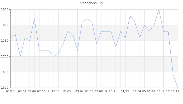 Date d'inscription : 20/01/18. Donateur pour EchecsEmail : Non ( Cliquez ici pour soutenir EchecsEmail. ) Elo non arrondi:1603.8 ( 322 sur 448 joueurs ) Nombre de victoires :5063 Nombre de nulles :395 Nombre de défaites :4201 Temps de réponse moyen par coup : 0J 1H 21M 52S ( Moyenne sur 6543 coups ). Rd ( Un petit rd indique un elo fiable ) : 58 Magic Elo:1310.91 Magic Rd : 170 Elo maximum atteint ( en étant classé ) :2020 Elo maximum atteint cette année :1880 Nombre coups joués : 313555 Inscrit dans l' équipe:Avalon Classement coupe : Inactif Points coupe : 0.03 Classement Coupe Magic Chess : Inactif Points Coupe Magic Chess : 0 Tournoi échelle : Inactif. Tournois gagnés : 23/11/2025 : Cat 3 : Victoire dans le tournoi n°27214 09/10/2025 : Cat 3 : Victoire dans le tournoi n°27036 06/10/2025 : Cat 3 : Victoire dans le tournoi n°27077 04/10/2025 : Cat 3 : Victoire dans le tournoi n°27103 24/09/2025 : Cat 3 : Victoire dans le tournoi n°27063 10/09/2025 : Cat 3 : Victoire dans le tournoi n°26969 02/09/2025 : Cat 3 : Victoire dans le tournoi n°26937 01/09/2025 : Cat 3 : Victoire dans le tournoi n°26976 28/08/2025 : Cat 3 : Victoire dans le tournoi n°26814 02/08/2025 : Cat 3 : Victoire dans le tournoi n°26917 02/08/2025 : Cat 3 : Victoire dans le tournoi n°26878 25/07/2025 : Cat 3 : Victoire dans le tournoi n°26899 23/07/2025 : Cat 3 : Victoire dans le tournoi n°26805 26/06/2025 : Cat 3 : Victoire dans le tournoi n°26823 19/06/2025 : Cat 3 : Victoire dans le tournoi n°26795 09/06/2025 : Cat 3 : Victoire dans le tournoi n°26712 02/06/2025 : Cat 3 : Victoire dans le tournoi n°26776 01/05/2025 : Cat 3 : Victoire dans le tournoi n°26663 15/04/2025 : Cat 3 : Victoire dans le tournoi n°26673 26/03/2025 : Cat 3 : Victoire dans le tournoi n°26548 22/03/2025 : Cat 3 : Victoire dans le tournoi n°26558 12/03/2025 : Cat 3 : Victoire dans le tournoi n°26531 11/03/2025 : Cat 3 : Victoire dans le tournoi n°26520 25/02/2025 : Cat 3 : Victoire dans le tournoi n°26534 12/02/2025 : Cat 3 : Victoire dans le tournoi n°26425 05/02/2025 : Cat 3 : Victoire dans le tournoi n°26436 26/12/2024 : Cat 3 : Victoire dans le tournoi n°26287 10/12/2024 : Cat 3 : Victoire dans le tournoi n°26121 29/11/2024 : Cat 3 : Victoire dans le tournoi n°26195 12/11/2024 : Cat 3 : Victoire dans le tournoi n°26124 03/11/2024 : Cat 3 : Victoire dans le tournoi n°26080 29/10/2024 : Cat 3 : Victoire dans le tournoi n°26012 28/10/2024 : Cat 3 : Victoire dans le tournoi n°26171 30/09/2024 : Cat 3 : Victoire dans le tournoi n°26112 25/09/2024 : Cat 3 : Victoire dans le tournoi n°26094 18/08/2024 : Cat 3 : Victoire dans le tournoi n°25901 12/06/2024 : Cat 3 : Victoire dans le tournoi n°25841 08/06/2024 : Cat 3 : Victoire dans le tournoi n°25657 31/05/2024 : Cat 3 : Victoire dans le tournoi n°25798 28/05/2024 : Cat 3 : Victoire dans le tournoi n°25837 20/05/2024 : Cat 3 : Victoire dans le tournoi n°25809 29/04/2024 : Cat 2 : Victoire dans le tournoi n°25704 27/04/2024 : Cat 3 : Victoire dans le tournoi n°25775 24/04/2024 : Cat 3 : Victoire dans le tournoi n°25761 19/04/2024 : Cat 2 : Victoire dans le tournoi n°25710 09/04/2024 : Cat 3 : Victoire dans le tournoi n°25720 29/03/2024 : Cat 3 : Victoire dans le tournoi n°25607 08/01/2024 : Cat 3 : Victoire dans le tournoi n°25486 05/01/2024 : Cat 3 : Victoire dans le tournoi n°25418 30/12/2023 : Cat 3 : Victoire dans le tournoi n°25433 18/12/2023 : Cat 3 : Victoire dans le tournoi n°25411 18/12/2023 : Cat 3 : Victoire dans le tournoi n°25392 12/12/2023 : Cat 2 : Victoire dans le tournoi n°25421 30/11/2023 : Cat 3 : Victoire dans le tournoi n°25394 29/11/2023 : Cat 3 : Victoire dans le tournoi n°25380 18/11/2023 : Cat 2 : Victoire dans le tournoi n°25349 16/11/2023 : Cat 2 : Victoire dans le tournoi n°25331 14/11/2023 : Cat 2 : Victoire dans le tournoi n°25333 10/11/2023 : Cat 3 : Victoire dans le tournoi n°25293 08/11/2023 : Cat 2 : Victoire dans le tournoi n°25321 07/11/2023 : Cat 3 : Victoire dans le tournoi n°25281 31/10/2023 : Cat 2 : Victoire dans le tournoi n°25230 27/10/2023 : Cat 2 : Victoire dans le tournoi n°25288 07/10/2023 : Cat 2 : Victoire dans le tournoi n°25223 24/09/2023 : Cat 2 : Victoire dans le tournoi n°25201 17/09/2023 : Cat 2 : Victoire dans le tournoi n°25198 08/08/2023 : Cat 3 : Victoire dans le tournoi n°25068 03/08/2023 : Cat 3 : Victoire dans le tournoi n°25097 27/07/2023 : Cat 3 : Victoire dans le tournoi n°25069 17/07/2023 : Cat 3 : Victoire dans le tournoi n°25036 10/07/2023 : Cat 3 : Victoire dans le tournoi n°25030 19/06/2023 : Cat 3 : Victoire dans le tournoi n°25002 28/05/2023 : Cat 3 : Victoire dans le tournoi n°24824 07/05/2023 : Cat 3 : Victoire dans le tournoi n°24822 22/04/2023 : Cat 3 : Victoire dans le tournoi n°24723 10/04/2023 : Cat 2 : Victoire dans le tournoi n°24790 09/02/2023 : Cat 3 : Victoire dans le tournoi n°24570 29/12/2022 : Cat 3 : Victoire dans le tournoi n°24518 25/12/2022 : Cat 3 : Victoire dans le tournoi n°24436 24/12/2022 : Cat 3 : Victoire dans le tournoi n°24346 22/12/2022 : Cat 3 : Victoire dans le tournoi n°24505 21/12/2022 : Cat 3 : Victoire dans le tournoi n°24470 08/12/2022 : Cat 3 : Victoire dans le tournoi n°24453 21/11/2022 : Cat 3 : Victoire dans le tournoi n°24381 12/11/2022 : Cat 3 : Victoire dans le tournoi n°24425 08/11/2022 : Cat 2 : Victoire dans le tournoi n°24350 21/10/2022 : Cat 2 : Victoire dans le tournoi n°24344 03/10/2022 : Cat 3 : Victoire dans le tournoi n°24281 27/08/2022 : Cat 3 : Victoire dans le tournoi n°24172 22/08/2022 : Cat 3 : Victoire dans le tournoi n°24163 18/08/2022 : Cat 3 : Victoire dans le tournoi n°24181 13/08/2022 : Cat 3 : Victoire dans le tournoi n°24149 30/07/2022 : Cat 3 : Victoire dans le tournoi n°24105 16/07/2022 : Cat 3 : Victoire dans le tournoi n°24037 28/06/2022 : Cat 3 : Victoire dans le tournoi n°24045 04/06/2022 : Cat 3 : Victoire dans le tournoi n°23966 26/05/2022 : Cat 3 : Victoir