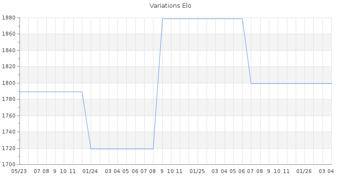 Date d'inscription : 10/09/07. Donateur pour EchecsEmail : Non ( Cliquez ici pour soutenir EchecsEmail. ) Elo non arrondi:1773.5 ( 235 sur 453 joueurs ) Nombre de victoires :14 Nombre de nulles :2 Nombre de défaites :31 Temps de réponse moyen par coup : 1J 9H 4M 46S ( Moyenne sur 2 coups ). Rd ( Un petit rd indique un elo fiable ) : 277 Magic Elo:1600 Magic Rd : 350 Elo maximum atteint ( en étant classé ) :1670 Elo maximum atteint cette année :0 Nombre coups joués : 1204 Classement coupe : Inactif Points coupe : 0 Classement Coupe Magic Chess : Inactif Points Coupe Magic Chess : 0 Tournoi échelle : Nombre de tournois gagnés :0