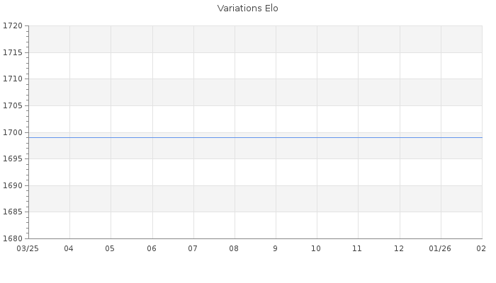 Date d'inscription : 02/03/25. Donateur pour EchecsEmail : Non ( Cliquez ici pour soutenir EchecsEmail. ) Elo non arrondi:1669 ( 0 sur 450 joueurs ) Nombre de victoires :0 Nombre de nulles :0 Nombre de défaites :0 Rd ( Un petit rd indique un elo fiable ) : 350 Elo maximum atteint ( en étant classé ) :0 Elo maximum atteint cette année :0 Nombre coups joués : 0 Inscrit dans l' équipe: Dangerous Bishops Classement coupe : Inactif Points coupe : 0 Classement Coupe Magic Chess : Inactif Points Coupe Magic Chess : 0 Tournoi échelle : Nombre de tournois gagnés :0