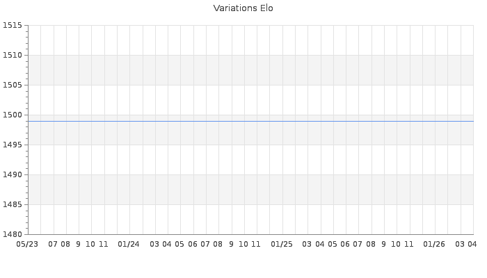 Date d'inscription : 24/03/20. Donateur pour EchecsEmail : Non ( Cliquez ici pour soutenir EchecsEmail. ) Elo non arrondi:1433 ( 0 sur 446 joueurs ) Nombre de victoires :0 Nombre de nulles :0 Nombre de défaites :0 Rd ( Un petit rd indique un elo fiable ) : 350 Elo maximum atteint ( en étant classé ) :0 Elo maximum atteint cette année :0 Nombre coups joués : 0 Classement coupe : Inactif Points coupe : 0 Classement Coupe Magic Chess : Inactif Points Coupe Magic Chess : 0 Tournoi échelle : Nombre de tournois gagnés :0