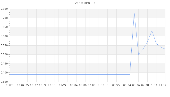 Date d'inscription : 31/03/13. Donateur pour EchecsEmail : Non ( Cliquez ici pour soutenir EchecsEmail. ) Elo non arrondi:1534 ( 351 sur 448 joueurs ) Nombre de victoires :702 Nombre de nulles :73 Nombre de défaites :697 Temps de réponse moyen par coup : 0J 12H 23M 48S ( Moyenne sur 740 coups ). Rd ( Un petit rd indique un elo fiable ) : 62 Magic Elo:1600 Magic Rd : 350 Elo maximum atteint ( en étant classé ) :1750 Elo maximum atteint cette année :1750 Nombre coups joués : 47305 Classement coupe : Inactif Points coupe : 0 Classement Coupe Magic Chess : Inactif Points Coupe Magic Chess : 0 Tournoi échelle : Inactif. Tournois gagnés : 03/11/2025 : Cat 2 : Victoire dans le tournoi n°26958 11/10/2025 : Cat 2 : Victoire dans le tournoi n°26975 22/11/2018 : Cat 1 : Victoire dans le tournoi n°18586 21/06/2018 : Cat 1 : Victoire dans le tournoi n°18152 19/10/2017 : Cat 2 : Victoire dans le tournoi n°16875 23/08/2017 : Cat 2 : Victoire dans le tournoi n°16928 12/08/2017 : Cat 2 : Victoire dans le tournoi n°16779 14/01/2017 : Cat 1 : Victoire dans le tournoi n°15855 16/11/2014 : Cat 1 : Victoire dans le tournoi n°16048 16/11/2014 : Cat 1 : Victoire dans le tournoi n°16025 02/09/2014 : Cat 1 : Victoire dans le tournoi n°15780 08/03/2014 : Cat 2 : Victoire dans le tournoi n°14594 06/03/2014 : Cat 1 : Victoire dans le tournoi n°14608 24/02/2014 : Cat 1 : Victoire dans le tournoi n°14178 16/02/2014 : Cat 1 : Victoire dans le tournoi n°14600 03/02/2014 : Cat 1 : Victoire dans le tournoi n°14543 13/01/2014 : Cat 1 : Victoire dans le tournoi n°14247 25/09/2013 : Cat 1 : Victoire dans le tournoi n°13262 05/07/2013 : Cat 1 : Victoire dans le tournoi n°12724 Nombre de tournois gagnés :19