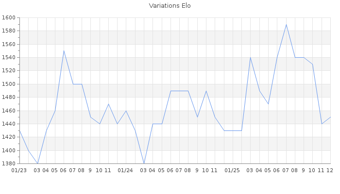 Date d'inscription : 09/03/18. Donateur pour EchecsEmail : Non ( Cliquez ici pour soutenir EchecsEmail. ) Elo non arrondi:1449.5 ( 397 sur 461 joueurs ) Nombre de victoires :424 Nombre de nulles :23 Nombre de défaites :503 Temps de réponse moyen par coup : 0J 20H 1M 7S ( Moyenne sur 500 coups ). Rd ( Un petit rd indique un elo fiable ) : 65 Elo maximum atteint ( en étant classé ) :1700 Elo maximum atteint cette année :1590 Nombre coups joués : 37191 Classement coupe : Inactif Points coupe : 0 Classement Coupe Magic Chess : Inactif Points Coupe Magic Chess : 0 Tournoi échelle : Tournois gagnés : 06/07/2025 : Cat 2 : Victoire dans le tournoi n°26815 05/03/2025 : Cat 2 : Victoire dans le tournoi n°26450 21/06/2024 : Cat 2 : Victoire dans le tournoi n°25836 21/08/2023 : Cat 2 : Victoire dans le tournoi n°25038 14/07/2023 : Cat 2 : Victoire dans le tournoi n°24924 24/05/2022 : Cat 2 : Victoire dans le tournoi n°23896 07/03/2022 : Cat 2 : Victoire dans le tournoi n°23653 20/01/2022 : Cat 2 : Victoire dans le tournoi n°23308 14/01/2022 : Cat 2 : Victoire dans le tournoi n°23510 25/10/2021 : Cat 2 : Victoire dans le tournoi n°23112 26/06/2021 : Cat 2 : Victoire dans le tournoi n°22834 29/06/2020 : Cat 2 : Victoire dans le tournoi n°21281 27/02/2020 : Cat 1 : Victoire dans le tournoi n°20678 04/07/2019 : Cat 2 : Victoire dans le tournoi n°19794 29/06/2019 : Cat 2 : Victoire dans le tournoi n°19450 04/09/2018 : Cat 2 : Victoire dans le tournoi n°18371 22/05/2018 : Cat 0 : Victoire dans le tournoi n°18095 Nombre de tournois gagnés :17