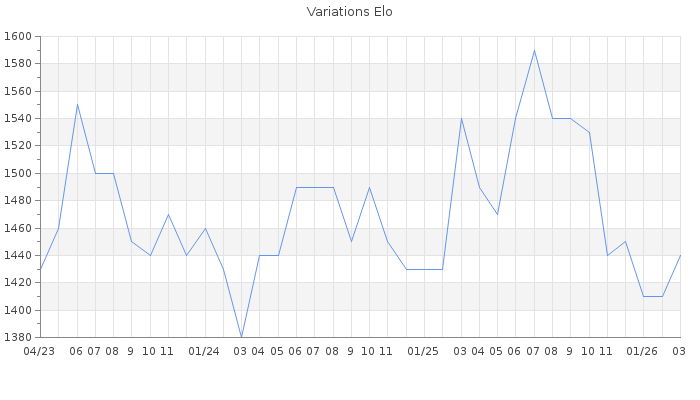 Date d'inscription : 09/03/18. Donateur pour EchecsEmail : Non ( Cliquez ici pour soutenir EchecsEmail. ) Elo non arrondi:1436 ( 382 sur 448 joueurs ) Nombre de victoires :432 Nombre de nulles :23 Nombre de défaites :514 Temps de réponse moyen par coup : 0J 15H 54M 59S ( Moyenne sur 710 coups ). Rd ( Un petit rd indique un elo fiable ) : 63 Elo maximum atteint ( en étant classé ) :1700 Elo maximum atteint cette année :1450 Nombre coups joués : 38134 Classement coupe : Inactif Points coupe : 0 Classement Coupe Magic Chess : Inactif Points Coupe Magic Chess : 0 Tournoi échelle : Tournois gagnés : 06/07/2025 : Cat 2 : Victoire dans le tournoi n°26815 05/03/2025 : Cat 2 : Victoire dans le tournoi n°26450 21/06/2024 : Cat 2 : Victoire dans le tournoi n°25836 21/08/2023 : Cat 2 : Victoire dans le tournoi n°25038 14/07/2023 : Cat 2 : Victoire dans le tournoi n°24924 24/05/2022 : Cat 2 : Victoire dans le tournoi n°23896 07/03/2022 : Cat 2 : Victoire dans le tournoi n°23653 20/01/2022 : Cat 2 : Victoire dans le tournoi n°23308 14/01/2022 : Cat 2 : Victoire dans le tournoi n°23510 25/10/2021 : Cat 2 : Victoire dans le tournoi n°23112 26/06/2021 : Cat 2 : Victoire dans le tournoi n°22834 29/06/2020 : Cat 2 : Victoire dans le tournoi n°21281 27/02/2020 : Cat 1 : Victoire dans le tournoi n°20678 04/07/2019 : Cat 2 : Victoire dans le tournoi n°19794 29/06/2019 : Cat 2 : Victoire dans le tournoi n°19450 04/09/2018 : Cat 2 : Victoire dans le tournoi n°18371 22/05/2018 : Cat 0 : Victoire dans le tournoi n°18095 Nombre de tournois gagnés :17