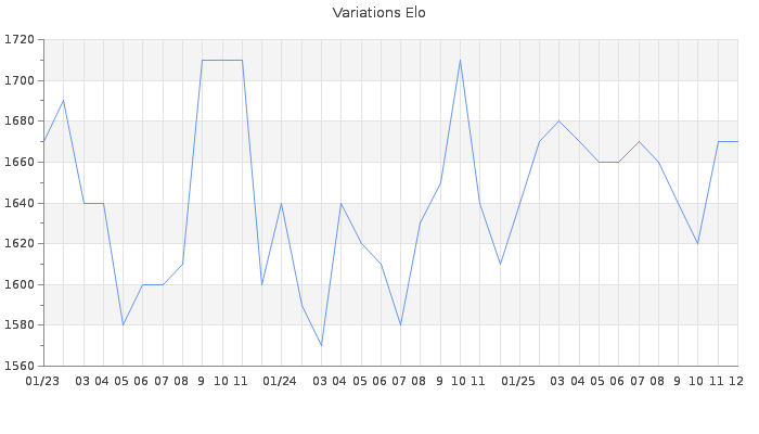 Date d'inscription : 21/05/20. Donateur pour EchecsEmail : Oui ( Cliquez ici pour soutenir EchecsEmail. ) Elo non arrondi:1669.1 ( 287 sur 449 joueurs ) Nombre de victoires :589 Nombre de nulles :211 Nombre de défaites :985 Temps de réponse moyen par coup : 0J 5H 31M 24S ( Moyenne sur 1662 coups ). Rd ( Un petit rd indique un elo fiable ) : 58 Magic Elo:1700 Magic Rd : 350 Elo maximum atteint ( en étant classé ) :1790 Elo maximum atteint cette année :1710 Nombre coups joués : 61563 Inscrit dans l' équipe:Avalon Classement coupe : Inactif, date de la dernière qualification : 01/03/23 Points coupe : 128.87 Classement Coupe Magic Chess : Inactif Points Coupe Magic Chess : 0 Tournoi échelle : Inactif. Tournois gagnés : 18/05/2021 : Cat 2 : Victoire CC Mar21 Asc 07/01/2021 : Cat 3 : Victoire dans le tournoi n°21951 06/01/2021 : Cat 3 : Victoire dans le tournoi n°22226 20/10/2020 : Cat 2 : Victoire CC Sep20 Asc 09/08/2020 : Cat 2 : Victoire dans le tournoi n°21469 05/07/2020 : Cat 2 : Victoire CC Juin20 Asc 13/06/2020 : Cat 1 : Victoire dans le tournoi n°21320 Nombre de tournois gagnés :7